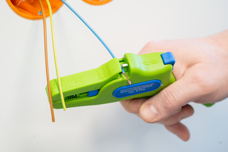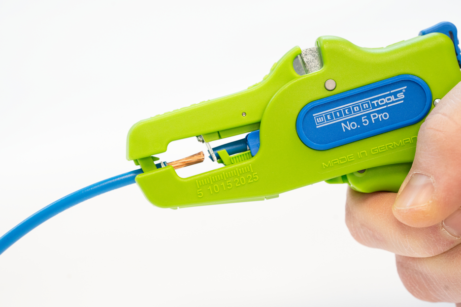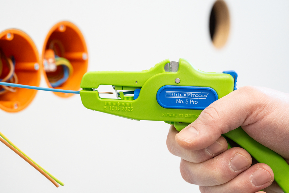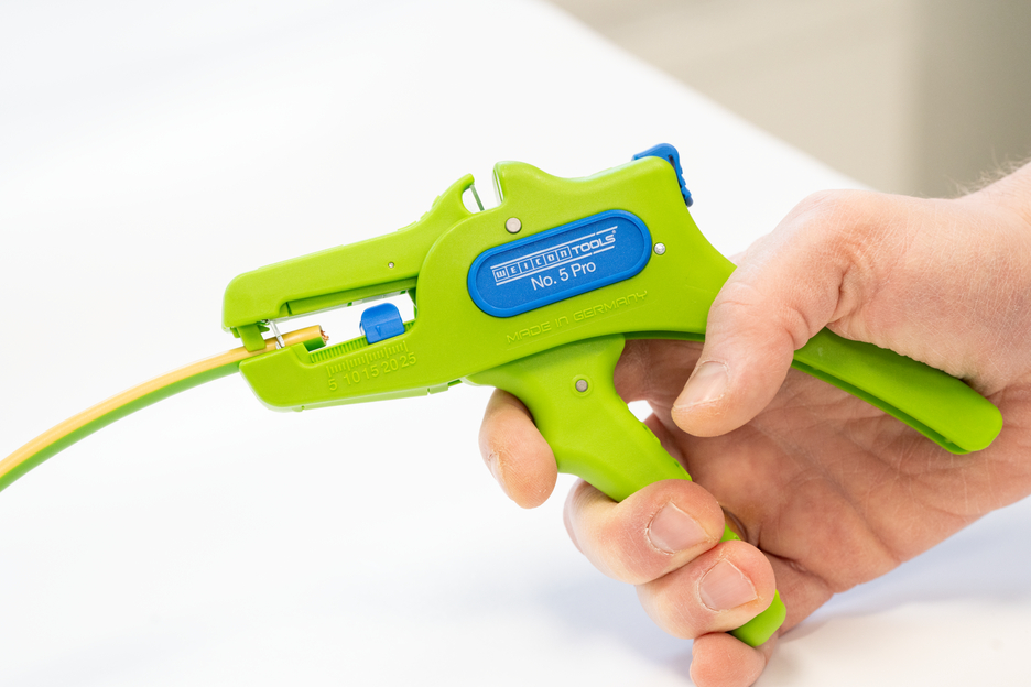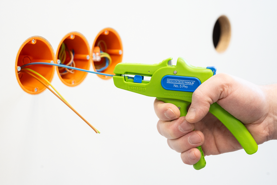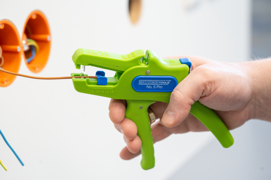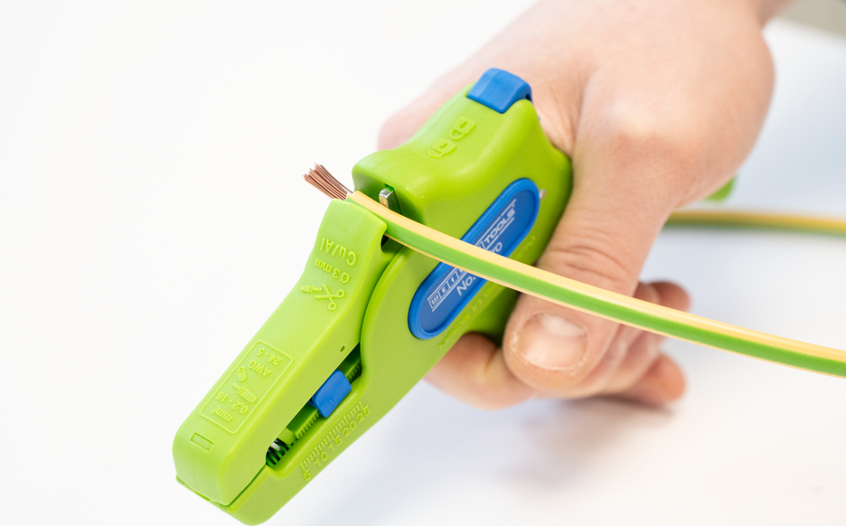 Die automatische Zange dient zum Abisolieren aller gängigen flexiblen und massiven Leiter von 0,2 bis 16 mm². Durch einen verstellbaren Längenanschlag von 5 bis 25 mm wird ein sehr präzises und genaues Arbeiten ermöglicht. Der Längenanschlag kann bei Bedarf auch herausgenommen werden. Die Zange stellt sich automatisch auf den jeweiligen Leiterquerschnitt ein – somit ist keine manuelle Einstellung erforderlich. In die Zange wurde ein Seitenschneider integriert, der sich für Leiter aus Kupfer und Aluminium bis zu einem Durchmesser von drei Millimetern eignet. Durch die schlanke Bauweise des Werkzeugs kann die Zange auch in schwer zugänglichen Arbeitsbereichen, wie beispielsweise in Schaltschränken, zum Einsatz kommen. Die Mechanik der Zange ist sehr leichtgängig und hat sich in Tests als langlebig und zuverlässig erwiesen. Die Zange verfügt über einen rutschfesten Mehrkomponenten-Griff im blau-roten „Ice-Crack“ Design. Durch die ergonomische Griffform liegt das Werkzeug gut in der Hand und gewährleistet ein ermüdungsfreies Arbeiten. Zusätzlich kann die Zange arretiert werden und lässt sich so platzsparend verstauen. Die Abisolierzange verfügt über eine Öse, an der ein Band zur Fallsicherung angebracht werden kann und wurde mit einer Beschriftungsfläche ausgestattet, um das Werkzeug individualisieren zu können.