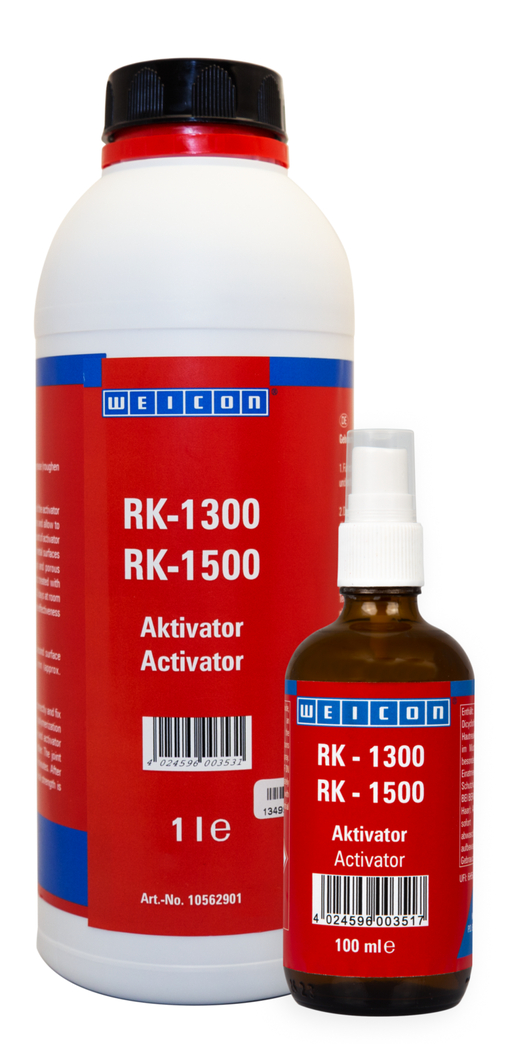 Für die prozesssichere Verarbeitung der MMA-Klebstoffe RK-1300 und RK-1500 in Großgebinden (800 g Dose, 330 g Kartusche, 6 kg Dose). Der Aktivator bewirkt die Aushärtung der Klebstoffe und steht in folgenden Gebindegrößen zur Verfügung: 100 ml Pump-Sprüher oder 1 l Flasche.