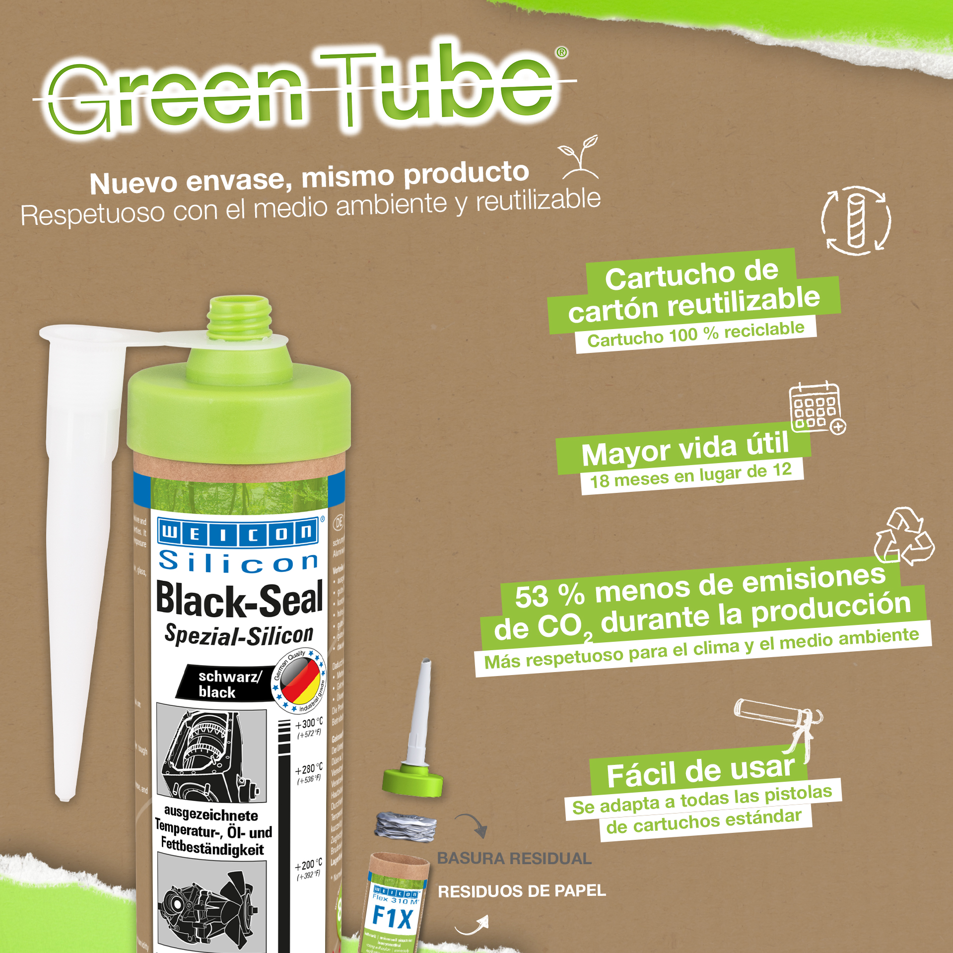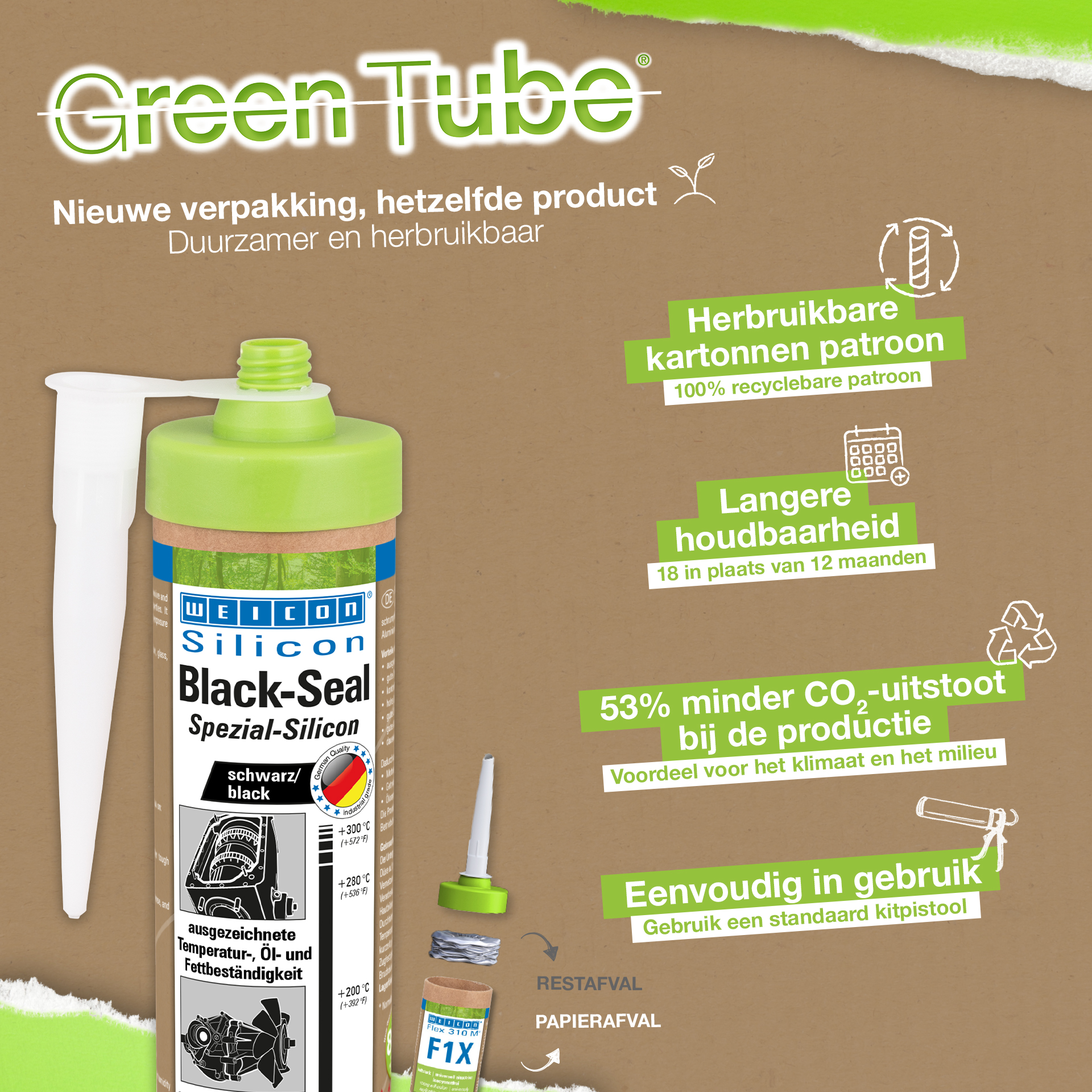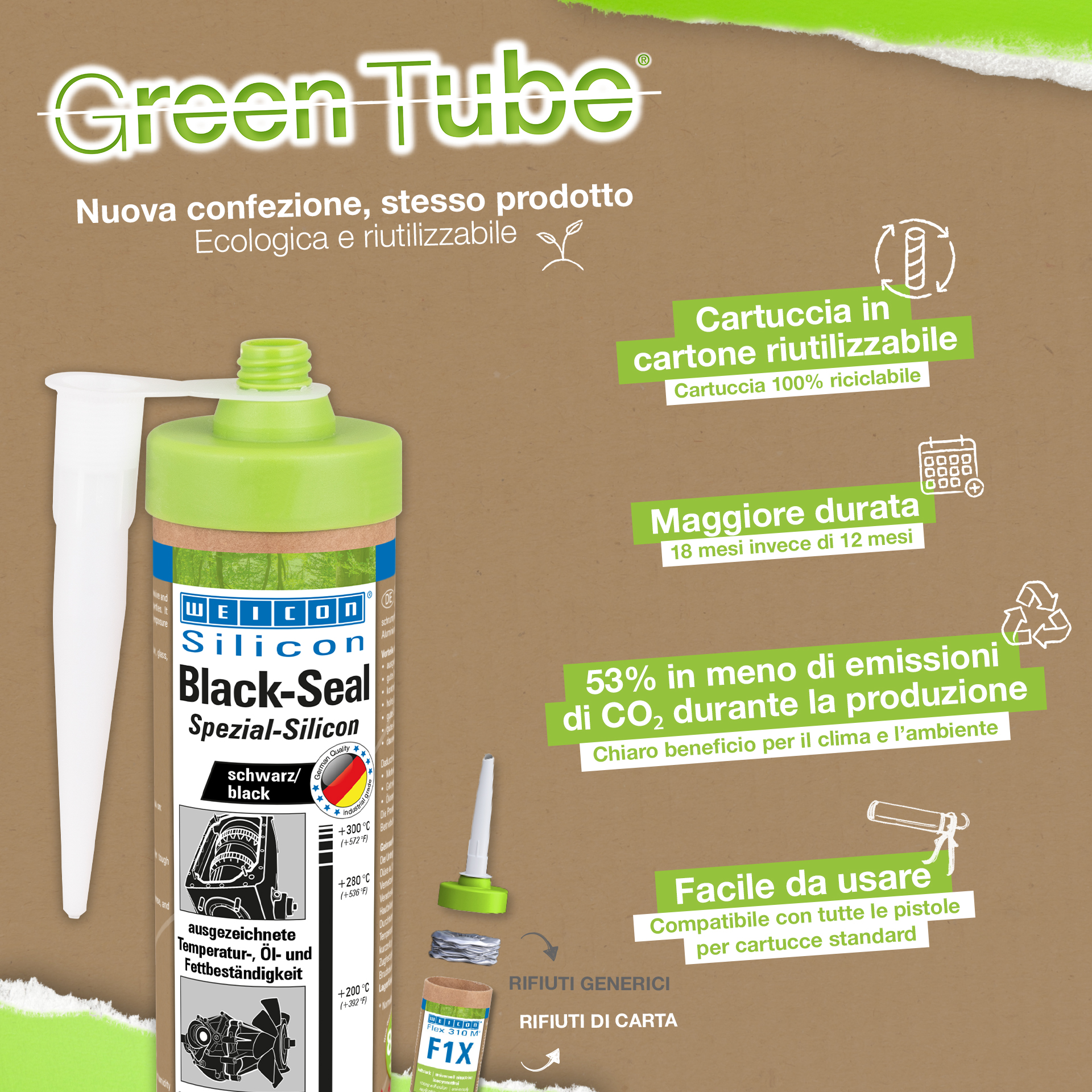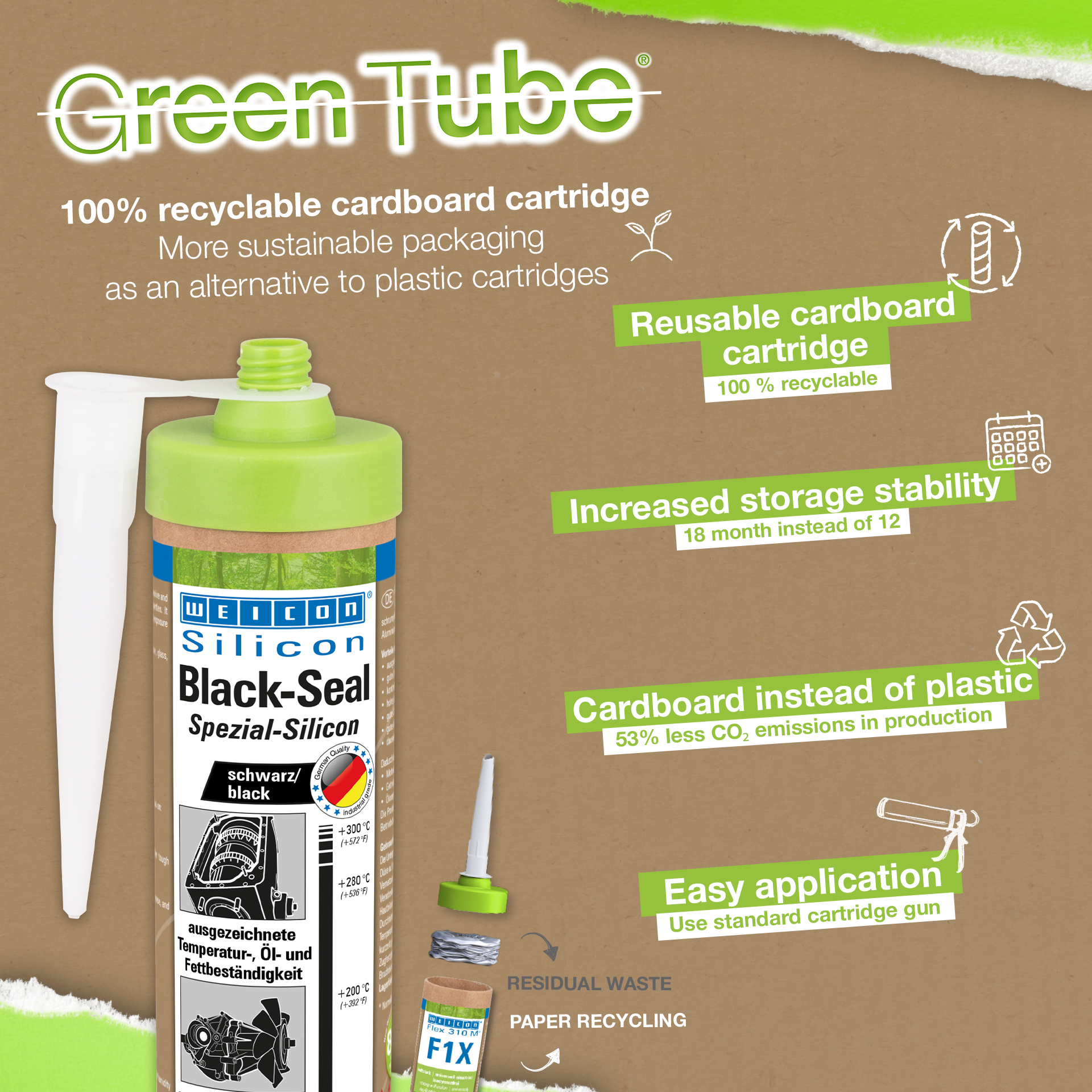 WEICON Black-Seal ist hochtemperaturbeständig (+280 °C/+536 °F), lösemittelfrei, haftstark, druckbeständig, alterungsbeständig und extrem elastisch (Bruchdehnung von ca. 500%). Es eignet sich für Verklebungen und ist für Abdichtungen geeignet, bei denen eine besonders hohe Öl- und Fettbeständigkeit erforderlich ist. Das Produkt kann an Getriebe-, Ventil- und Gehäusedeckeln, Ölwannen und Ölpumpen, Wasserpumpen, Getrieben und Achsen, Flanschen, Tanks und Behältern und in vielen anderen Bereichen zum Einsatz kommen.