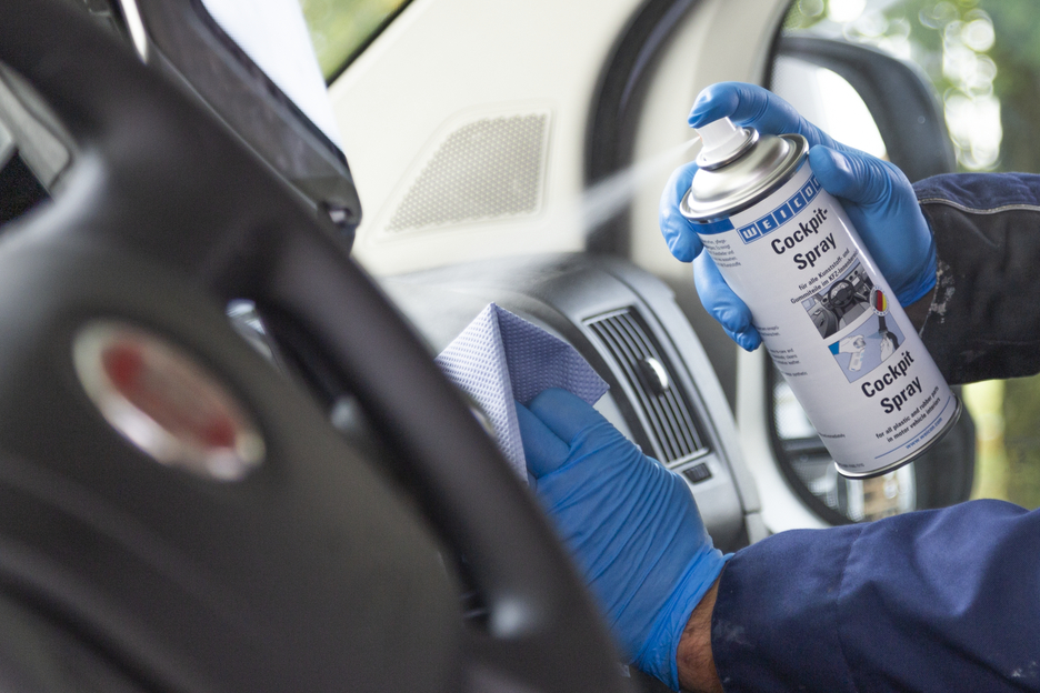 WEICON Cockpit-Spray ist ein wasserabweisendes Pflegemittel für alle Kunststoff- und Gummiteile sowie lackierte Holzoberflächen im KFZ-Innenbereich. Der dauerhafte, unsichtbare Schutzfilm verhindert Verschmutzungen und schafft einen pflegeleichten, staubabweisenden Seidenglanz. Cockpit-Spray frischt stumpfe und verwitterte Kunststoffe wieder auf, Gummi versprödet nicht und bleibt geschmeidig und elastisch. WEICON Cockpit-Spray beseitigt Quietsch- und Knarrgeräusche, pflegt Armaturenbretter, Innenverkleidungen, alle Kunststoff- und Gummiteile, Leder, Holz und Chrom sowie kunstlederbezogene Autodächer, verhindert das Festfrieren von Tür-, Fenster- und Kofferraumdichtungen, wird als Schmiermittel an Sicherheitsgurten, Sitzführungen, Schiebedächern, Fensterführungen, Türschlössern und überall dort eingesetzt, wo Fette Verschmutzungen hervorrufen würden.