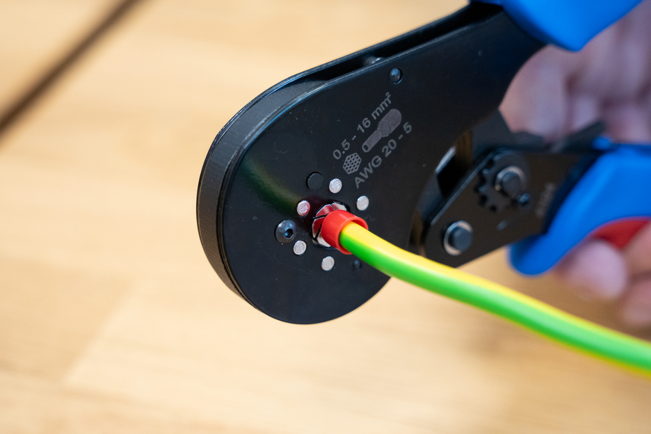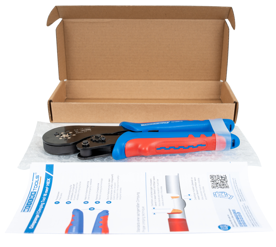 Die Crimpzange 16 mm² HEX wurde speziell für das prozesssichere Vercrimpen von Aderendhülsen entwickelt. Sechs synchron angetriebene Crimpbacken erzeugen als Hexagon eine Sechskantpressung, die das Einführen bei runden Anschlussklemmen erleichtert. Das sechseckige Crimpprofil mit gezahnten Pressbacken aus mehrfach gehärtetem Kohlenstoffstahl sorgt für dauerhafte elektrische Verbindungen. Eine selbsteinstellende Anpassung auf die gewünschte Aderendhülse erlaubt ein schnelles Arbeiten bei unterschiedlichen Querschnitten. Die Zange verfügt über einen Ratschen-Mechanismus mit Zwangssperre für eine gleichbleibend hohe Crimpqualität und ein wiederholgenaues Arbeiten. Die Crimpzange öffnet sich erst, wenn der Crimpprozess vollständig abgeschlossen ist. Zusätzlich wurde eine Notentriegelung im Griff integriert, die im Fall einer Fehlanwendung die Zange wieder öffnet. Mit der präzisen Exentereinstellung kann die Crimpkraft exakt justiert werden. Dadurch liefert die Zange eine dauerhaft hohe Crimpqualität. Mit der Crimpzange 16 mm² HEX lassen sich Aderendhülsen im Arbeitsbereich von 0,5-16 mm² (AWG 20-5) bearbeiten. Die 2-Komponenten-Griffe der Zange gewährleisten ein rutschfestes und ergonomisches Arbeiten mit maximaler Kraftübertragung. Dabei wurde das bewährten „Ice-Crack-Design“ verwendet, das für eine angenehme Haptik sorgt. Die integrierten Ösen an den Griffen dienen zur Befestigung einer Fallsicherung.