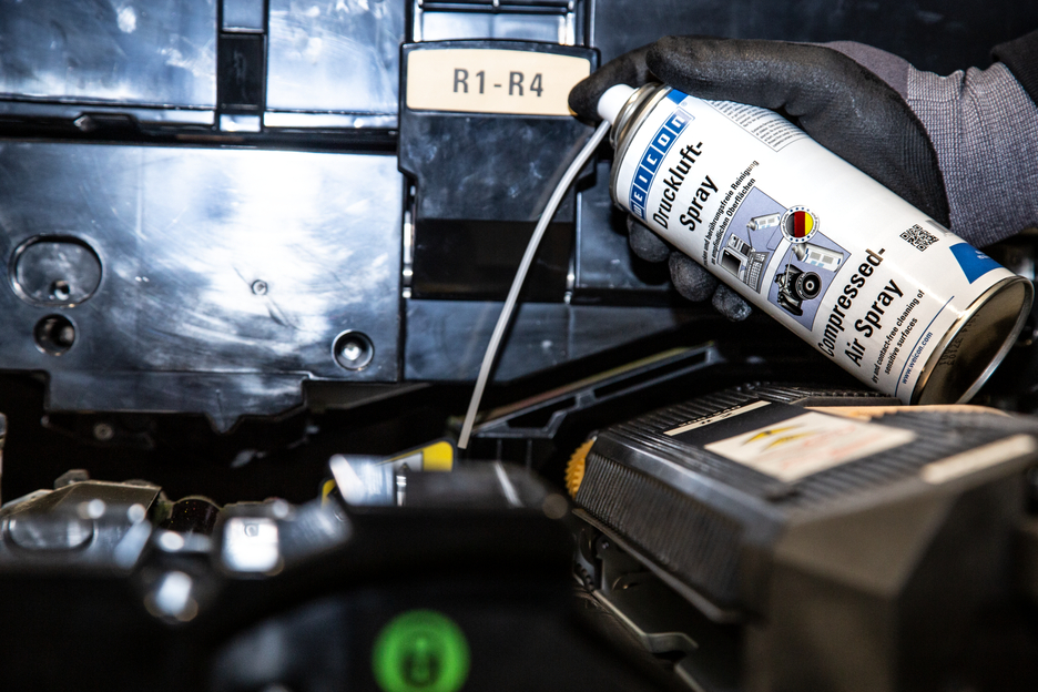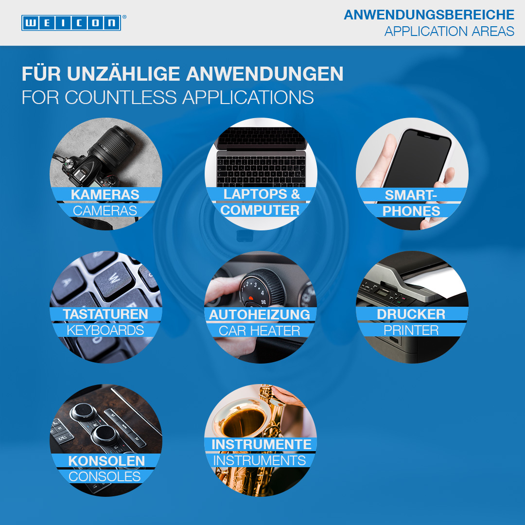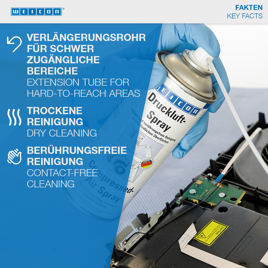 WEICON Druckluft-Spray kann überall dort eingesetzt werden, wo Staub auf herkömmliche Weise nur schwer entfernt werden kann. Es erlaubt eine trockene, berührungsfreie Reinigung auch in unzugänglichen Winkeln und auf empfindlichen Oberflächen. Druckluft-Spray kann an Hifi- und Videogeräten, (z.B. Modulen, Leiterplatten, Magnetköpfen, Laufwerken etc.), in der Optik (z.B. Kameras, Objektive, Linsen), an KFZ-Sicherungskästen und -Scheibenwaschanlagen, an Uhrwerken (Quarzuhren), in der Medizintechnik, im Modellbau, in der Messtechnik, an Elektronikbauteilen und an Leiterplatten zum Einsatz kommen.