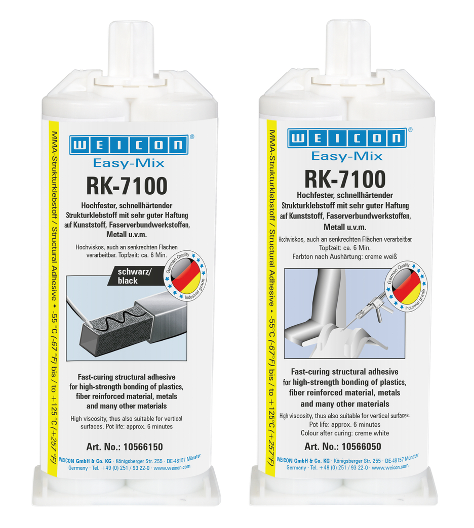 Der Acrylat-Strukturklebstoff WEICON RK-7100 verbindet viele Materialien, wie Kunststoffe, Metalle oder Keramik, mit hoher Zug-, Scher- und Schälfestigkeit mit- und untereinander. Er eignet sich besonders für strukturelle Verklebungen, bei denen hochfeste Verbindungen benötigt werden. Der Klebstoff ist sehr zähflüssig und eignet sich aus diesem Grund auch zur Verarbeitung an senkrechten Flächen. RK-7100 ist universell einsetzbar und kann beispielsweise in der Kunststofftechnik, im Metallbau, im Karosserie- und Fahrzeugbau, im Maschinenbau, in der Elektrotechnik, im Modell- und Formenbau oder im Messe- und Ausstellungsbau verwendet werden. Für die Verarbeitung der Easy-Mix Produkte im 50 ml Gebinde wird die Dosierpistole Easy-Mix D 50 benötigt.