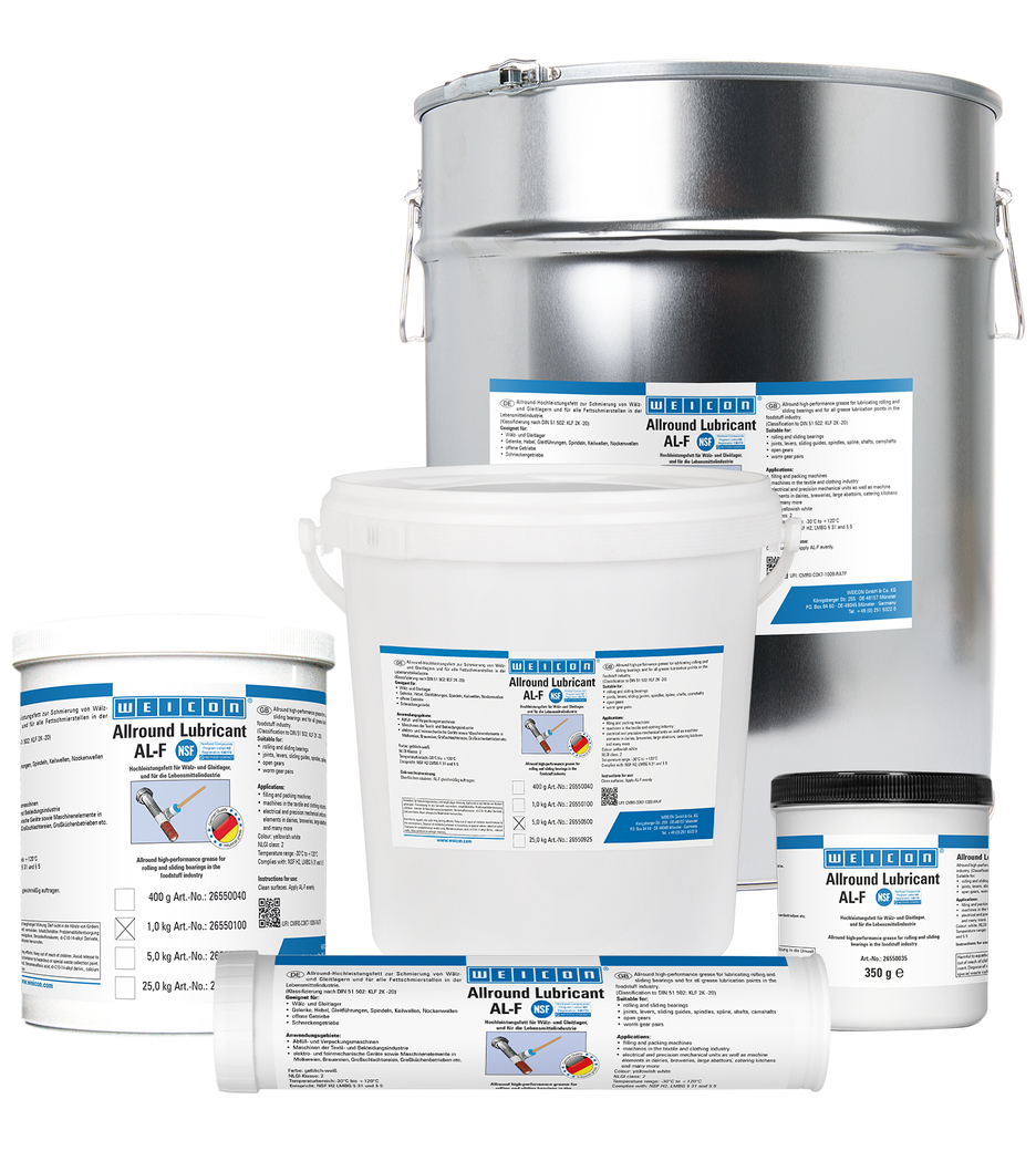 WEICON AL-F can be used to lubricate roller and slide bearings, joints, levers, sliding guides, spindles, spline shafts, camshafts, open gears, worm gears and all grease lubrication points. Owing to its NSF approval H2, the grease is suitable for use in the food industry.