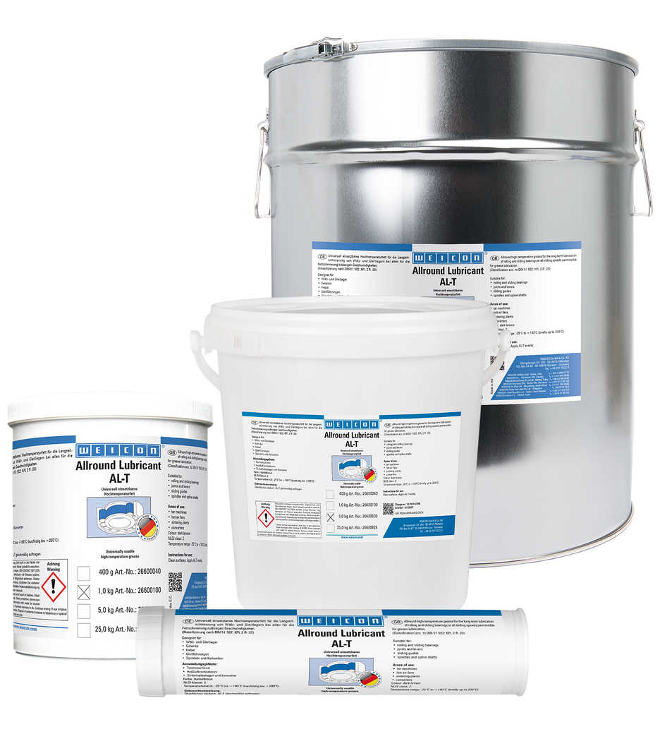 WEICON AL-T is suitable for roller and slide bearings, joints, levers, sliding guides, spindles, spline shafts, and at all sliding speeds permitted for grease lubrication. AL-T can be used in many industrial applications.