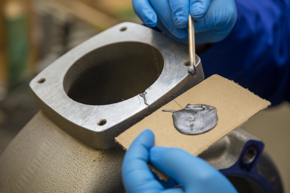 Adhesive for bonding aluminium and other light metals to each other. WEICON Aluminium Minute Adhesive can be used to fill cracks and holes, for example in aluminium housings, and for repairing light alloy wheels. Aluminium Minute Adhesive is a low-odour, two-component, aluminium-filled epoxy adhesive. It is resistant to high temperatures up to +180 °C and cures quickly at room temperature. After curing, the adhesive can be machined (filing, drilling, milling). Aluminium Minute Adhesive is gap-filling and non-dripping (thixotropic) and offers very high tensile and impact strength. To achieve optimal adhesion, the bonding surfaces should be dry and free from grease or dirt. Scraping or sanding the surfaces before cleaning additionally improves adhesion.
