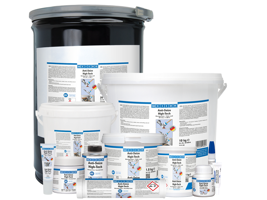 The assembly paste WEICON Anti Seize High-Tech is high-temperature-resistant, has excellent separating characteristics, is metal-free, neutral to materials and has an NSF registration. It is particularly suitable when metal-containing pastes can cause electrolytic reactions, when nickel-containing products should or may not be used due to health reasons and when dark metal-containing products should or may not be used for visual reasons.
