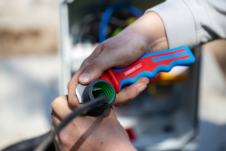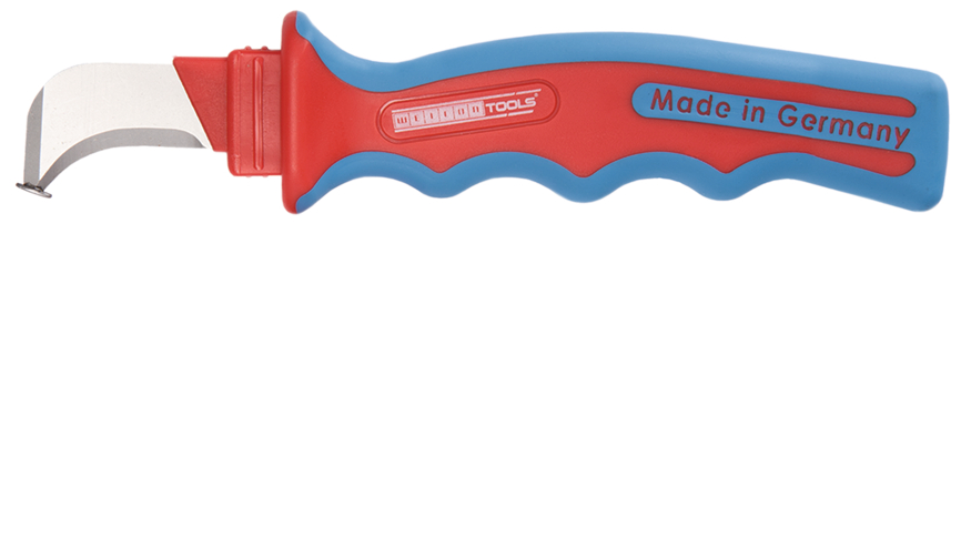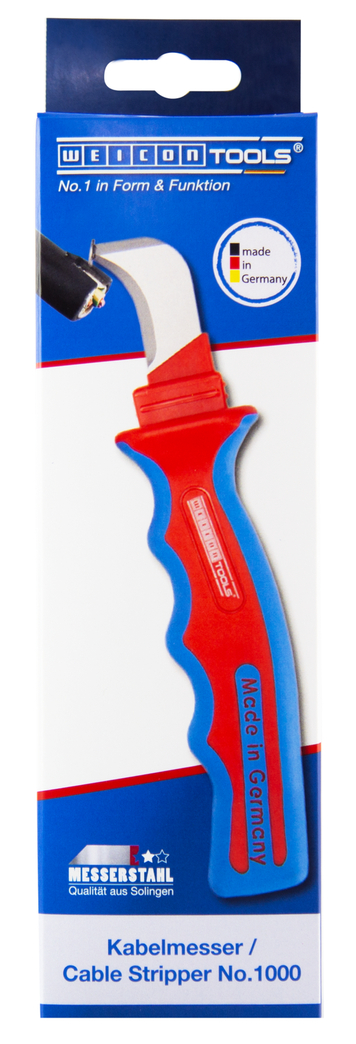 Cable Stripper HD No. 1000 is very robust and enables precise, fast and safe stripping of particularly thick cable types. The different layers of multi-insulated cables can easily be cut with the HD No. 1000. The bent blade tip limits the cutting depth and prevents damage of the inner conductors. The blade is tested according to DIN EN 60900 for working on live cables and can withstand up to 1000 volts.