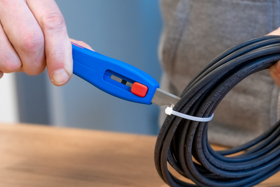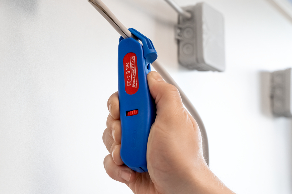 The Cable Stripper S 4-28 enables precise, fast and safe stripping of all common round cables with a diameter between 4 and 28 millimetres. Thanks to the adjustment screw in the housing, the cutting depth of the knife can be set with an infinitely variable range. This prevents damaging the inner conductor. The cutting blade is integrated in the housing and self-rotating, thus enabling the automatic adjustment from circular to longitudinal cutting. In addition, a hook blade has been integrated into the S 4-28, which can be retracted into the housing. The blade is lockable in both positions. This leads to a significant reduction in the risk of injury that fixed blades bring with them.