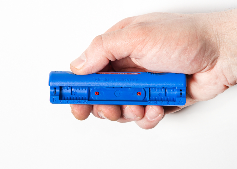 Easy handling thanks to ergonomic shape I Length scale (0 - 25 mm) integrated in the housing I Adjusting the cutting depth not required I Two-level stripping of all common coaxial cables I Working range 4.8 - 7.5 mm Ø I Also suitable for flexible cables