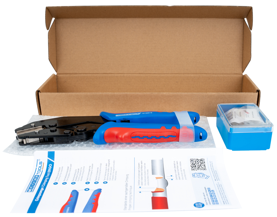 ERGO-CRIMP was developed for the process-safe crimping of various electrical connectors. The crimping tool has a ratchet mechanism with a blocking device to ensure a consistently high crimping quality and results that can be precisely repeated. The mechanism only opens the tool when the crimping process is complete. In addition, an emergency release has been integrated into the handle, which allows the user to open the crimping tool whenever necessary, e.g. in the event of misuse. Another special feature is the adjustable crimping force, which ensures a high crimping quality thanks to the precise eccentric setting. With the Multi Change System, the crimp modules can be exchanged quickly, as needed. The simple change system, which requires no additional tools, ensures that the modules can be installed and removed fast. The ERGO-CRIMP tool includes three pairs of modules made of high-quality steel. One module is suitable for MC4 connectors with cable cross-sections of 2.5 mm², 4 mm² and 6 mm² (14-10 AWG). Another pair of modules is suitable for insulated wire end ferrules from 0.25-6 mm² (AWG 24-10). The third pair of modules was developed for insulated cable lugs from 0.5-6mm² (AWG 22-10). The three pairs of modules are stored safely and protected from dust in a small plastic box. Additional module pairs are also available as accessories. The 2-component handles ensure non-slip and ergonomically friendly handling for maximum force transmission. The tried-and-tested “ice-crack design” was used, which ensures a comfortable feel. The integrated eyelets on the handles can be used to attach a safety catch.