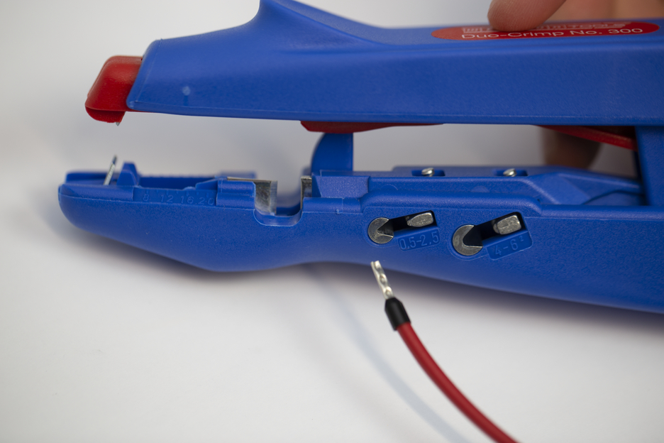 Stripping and crimping with just one tool I Stripping from 0.5 mm² to 6.0 mm² I Two crimping areas (0.5 - 2.5 mm² and 4.0 - 6.0 mm²) according to DIN 46228-2 I Integrated, well-accessible side cutter up to 6 mm²