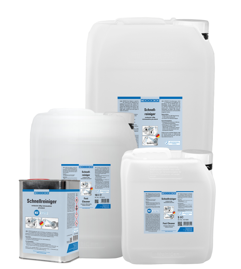 The Fast Cleaner has an NSF registration for the food sector and can therefore be used as a cleaning and degreasing agent for the removal of contamination generated during maintenance work and for the removal of adhesive residues in the food and beverage industry as well as in the pharmaceuticals and chemical industries. Fast Cleaner is used to clean and degrease surfaces which are bonded or sealed with WEICON adhesives and sealants, or which are going to be coated with WEICON Metal Sprays. Fast Cleaner is pH-neutral and material-compatible and can be used on many different materials such as metals, glass, ceramics and most rubbers and plastics. Due to its special formula and the resulting NSF registration, the Fast Cleaner can contribute towards improvements in occupational safety and health protection.