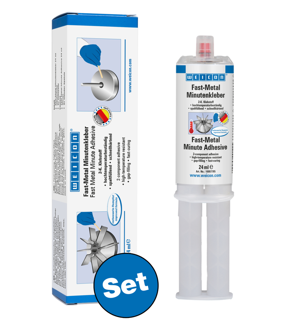 WEICON Fast-Metal Minute Adhesive is ideal for repairs and bondings with larger bonding gaps or bigger tolerances. Its gap-filling properties make it suitable for rough and poorly fitting surfaces as well as for filling in cracks, cavities and unlevelled surfaces. WEICON Fast-Metal Minute Adhesive can be used on numerous materials such as metal, plastic, fibre-reinforced materials, ceramics, glass, stone and wood.