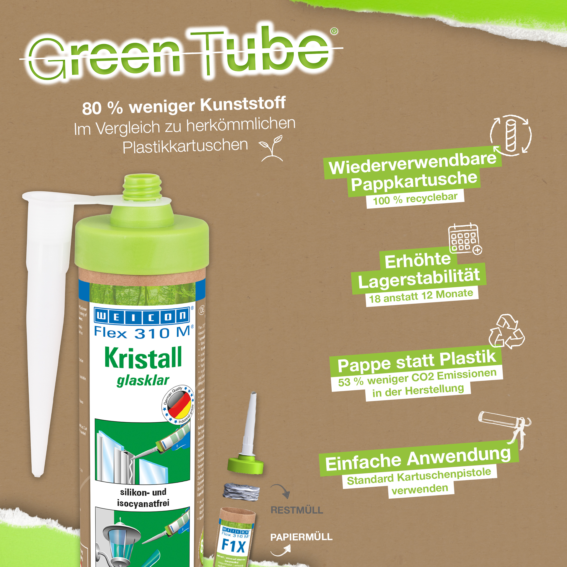 WEICON Flex 310 M Crystal is transparent, strong, paintable (wet-on-wet), sandable, has an outstanding resistance to ageing and good resistance to UV rays. It contains no silicone, isocyanate, halogens or solvents. It has an ISEGA certificate and can be used as an adhesive in the food technology. Flex 310 M Crystal is an elastic adhesive suitable for bonding glass, PC* and acrylic glass*, metals, many plastics, ceramics, wood and stone. The product is crystal clear after curing and is particularly suited for elastic joints where the adhesive should or must not be visible. It can be used in plastic processing, metal construction, tank and apparatus engineering, in ventilation and air conditioning systems, the electrical and lighting industry, in exhibition stand construction and shopfitting, and in all applications where silicones or products containing silicones are not suitable. (* = only for tension-free bonding)