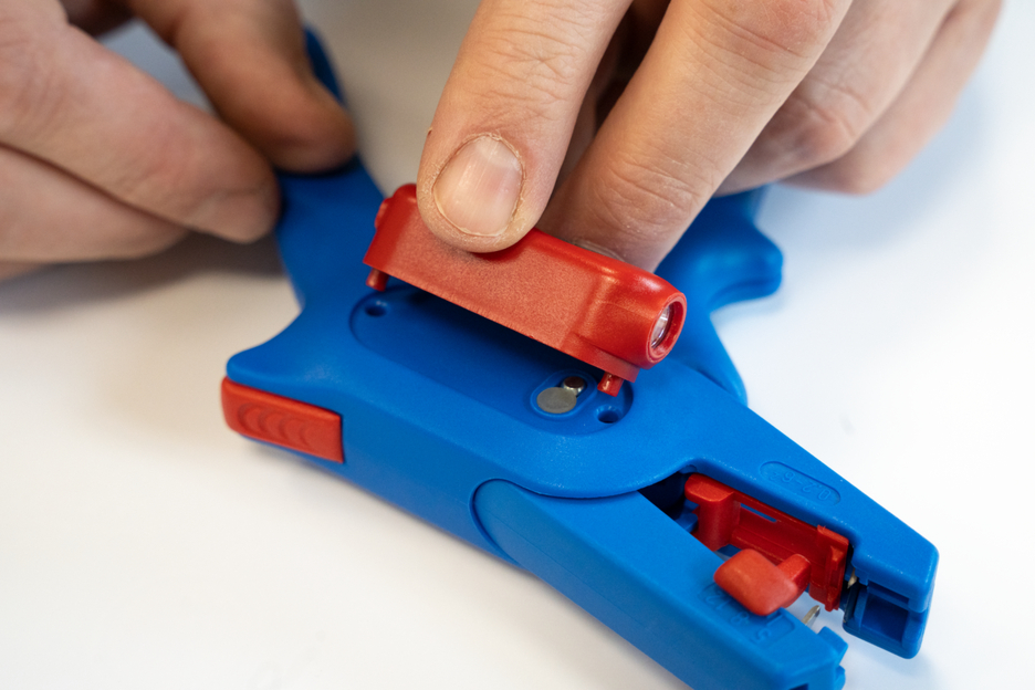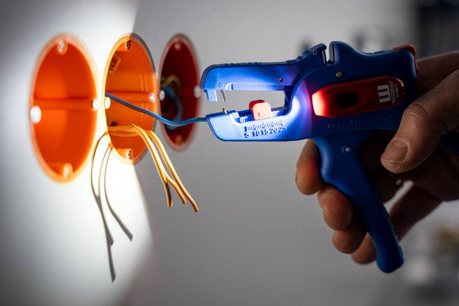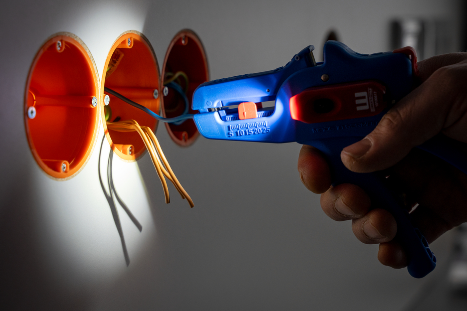 Electricians should always work with the power turned off when handling electrical installations, wires or devices. During work, e.g. in a construction site, there is often insufficient lighting or illumination. This new work light offers a perfect solution. The work light is very easy to attach to the stripping tool. To attach it, simply remove the printed plastic plate on one side of the stripper and press the light with its two mounting points into the designated holes. This ensures that the work light always remains in the correct position and cannot fall or slip. The lamp is switched on by pressing the switch. Press several times to select the brightness level (three levels with 50, 127 or 250 lumens). To switch off the lamp, press and hold the on/off switch. The LED Work Light has a length of 48 mm and a weight of 15 g. The LED light has IP65 certification and is both dustproof and splash-resistant. The Work Light has a 180 mAh lithium battery and can be used for approx. 2 hours on a medium setting after a charging time of 40 minutes. The service life of the battery charge varies depending on the selected light intensity. The WEICON TOOLS LED Work Light is available in the colours red and black.