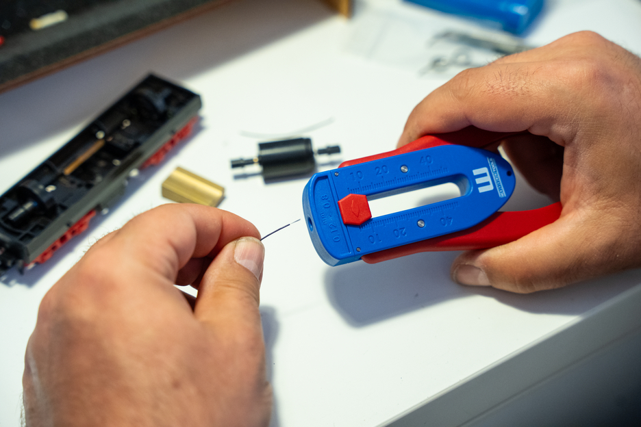 Semi-automatic wire stripper for the fast and safe stripping of very fine conductors, strands or wires with small diameters in the range of 0,12 mm - 0,8 mm (3620 AWG). With the adjustable scaled length stop for the working range from 5 to 45 millimetres, the desired stripping length can be set quickly and reliably. Two durable, precisely adjusted torsion springs, which push symmetrically on the pair of blades with a defined force, ensure comfortable working. That way, the respective insulation is cut with the right pressure. In combination with the scanning system that is integrated in the tool, this ensures damage-free stripping. The tool is suitable for both right- and left-handed users.
