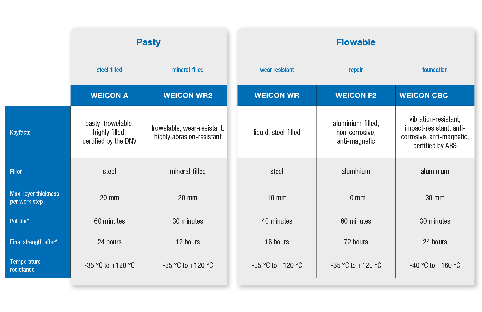 The repair compounds are used for repairing cavitation and corrosion damage, for repairing moulds, press moulds and holding devices as well as for pipe repair. They are also ideal for filling cavities and reconstructing components. The epoxy resin systems are used on containers, tanks, pipes, pumps, valves, shafts, etc. The epoxy resins differ in their filler material, their viscosities and curing times and their temperature resistances.