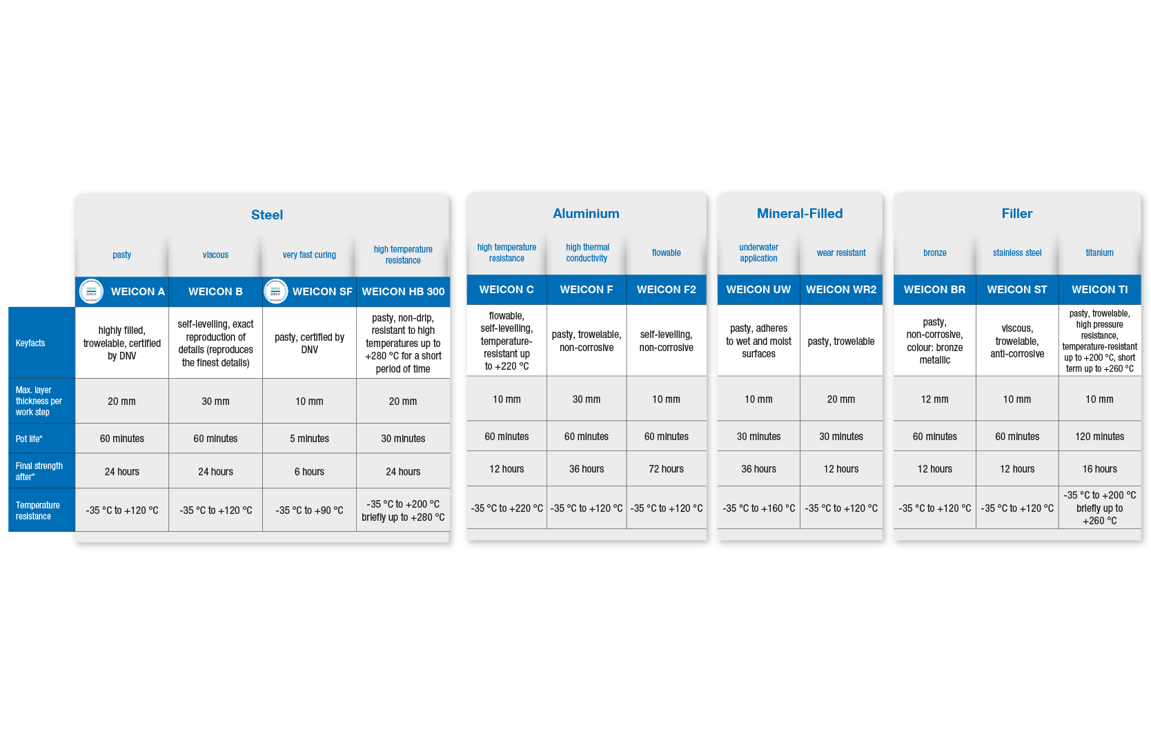 Depending on the type, the epoxy resin system contains a different resin component, such as steel or aluminium powder or mineral fillers. This improves the technical properties of the adhesive. Depending on the filler material, for example, an especially high abrasion resistance, impact resistance, compressive strength as well as temperature resistance can be achieved.
