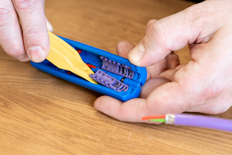 With the Profibus Stripper No. 2, the outer sheath and the underlying shield can be cleanly cut in order to strip the Profibus cable according to its connector. The optical length scale in the module can be used to select the appropriate stripping length to prepare the Ethernet cables to fit the FastConnect connector. For the stripping lengths of 17 mm, 20 mm, 24 mm and 30 mm, the usual dimensions are visually marked in the module. The stripper was developed to cut Profibus cables in the range of 5.5 mm to 8 mm with two pairs of blades simultaneously for a precise fit. The cutting pattern creates an ideal preparation for FastConnect connectors - even with different cable diameters. If necessary, the pairs of knives in the half-shells can be replaced or renewed as modules.