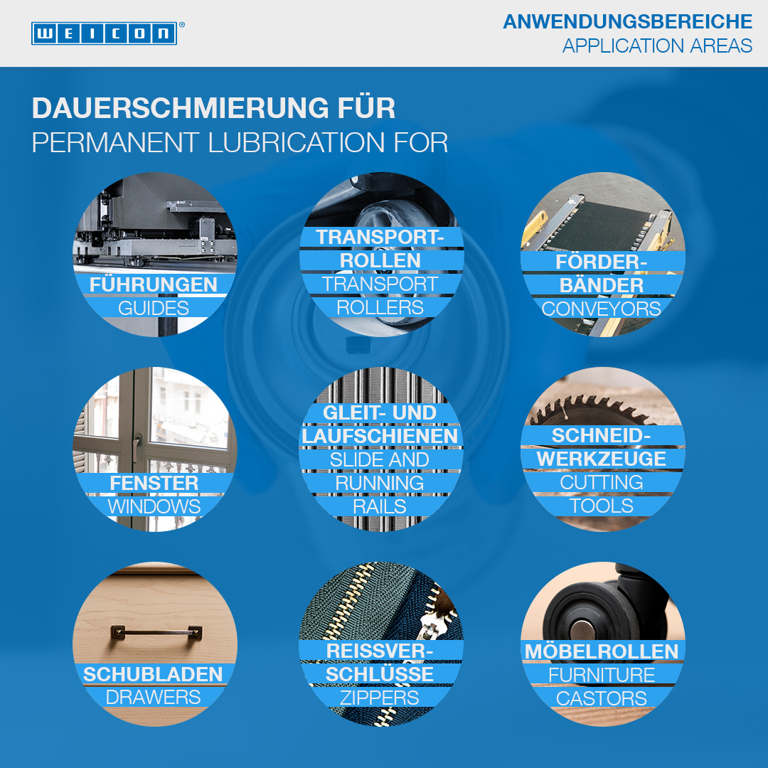 WEICON PTFE-Spray is a grease-free, dry lubricant based on PTFE with excellent sliding properties. PTFE Spray adheres to all metal, plastic and wood surfaces. Its high PTFE content greatly reduces the friction coefficient. The coating repels dirt, dust and water and is resistant to oils, greases and many chemicals. WEICON PTFE Spray can be used on runners and guides, conveyor belts, transport rollers, slides, windows, cutting tools and packing machines. It can also be used as a as a water-repellent coating for paper seals, cork seals and seal packaging, as a substitute for release agents containing silicone, and wherever oil or grease lubrication is not permitted or desired.