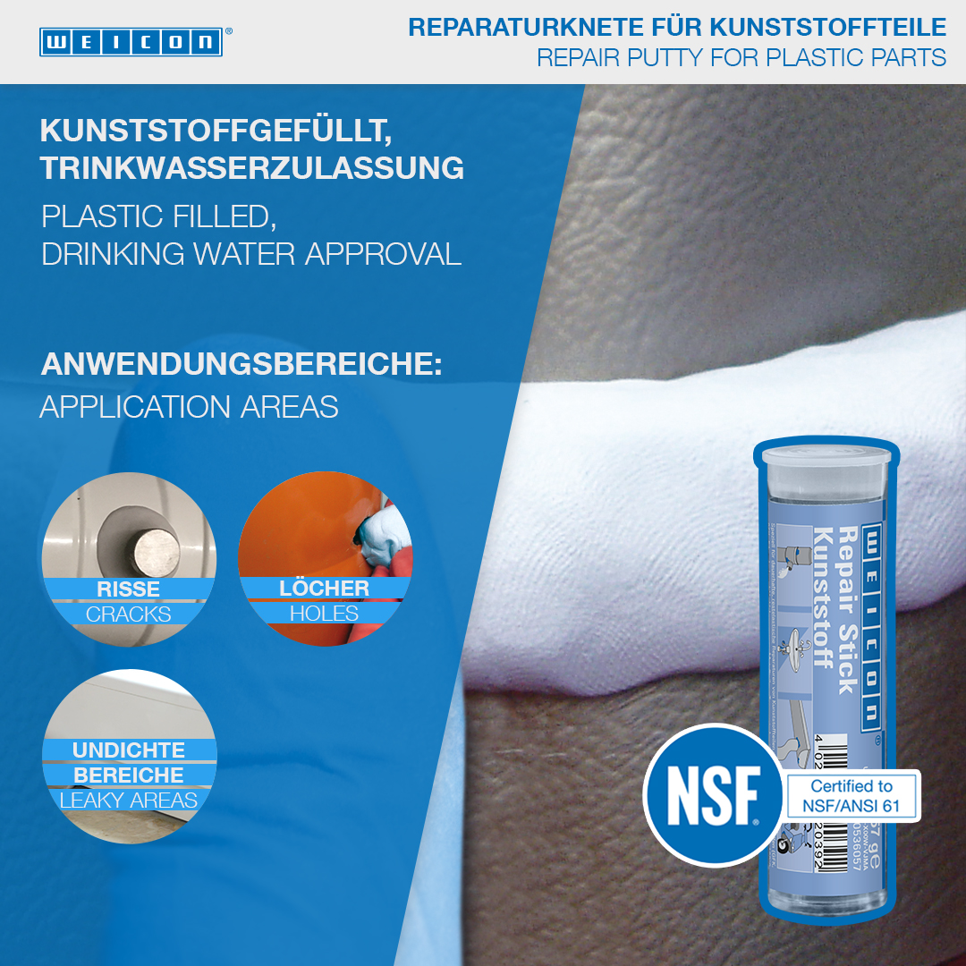 WEICON Repair Stick Plastic was developed specifically for long-lasting repairs of plastic components and composite materials such as window and door frames, panelling and bumper bars. It remains elastic permanently. It is suitable for bonding metal pieces, such as pipes and pipe bends, fittings and flanges, water tanks, pumps and housings. The Repair Stick can be used in window construction, container and apparatus construction, in the food, cosmetics and pharmaceutical industries and in many other areas.