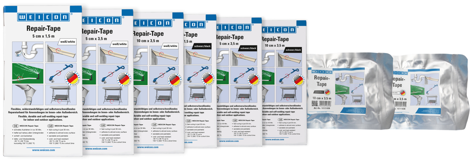 Flexible, durable and self-fusing repair tape made of glass-fibre reinforced plastic for quick emergency repairs in indoor or outdoor areas. The tape is soaked with a special resin and is activated by contact with water. It can be applied very easily and fast and shows very high adhesive strength on almost all surfaces. After just 30 minutes, the tape is fully cured and hard-wearing. After curing, the tape can be sanded and painted over. It has high chemical and temperature resistance – from 50 °C / (-58 °F) to +150 °C (302 °F) for short periods. The tape can be applied without additional tools and is used for reliable and durable repairs in industrial applications, skilled trades, around the house, and in the camping and DIY sector.