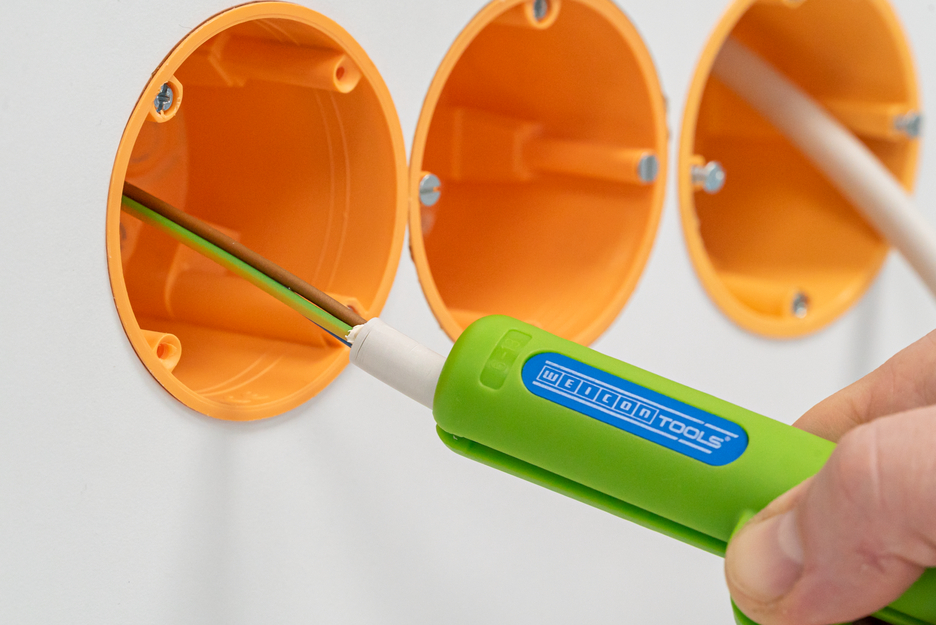 The WEICON TOOLS Green Line is a unique product range specifically designed with sustainability and resource conservation in mind. The Green Line features stripping tools made with up to 97 % renewable and natural materials The Round Cable Stripper No. 13 Green Line enables fast and convenientstripping of all common round and wet room cables with adiameter of 6.0 - 13.0 mm (e.g. NYM cables 3 x 1.5 mm² to 5 x 2.5mm²). Adjusting the cutting depth manually is not necessary. Thenew working range is thus also suitable for smaller wire diametersfrom 6 mm, such as 3 x 0.75 mm². Thanks to the ergonomichandle shape, the tool is particularly comfortable to use.The distinctive handle of the Round Cable Stripper No. 13ensures a safe, non-slip grip. This helps to make daily work easierand also improves work safety. The rounded and space-savingtool head perfectly matches the modern wall box geometry. The longer shape makes access even easier when stripping in deep-set cavity wall boxes and spaces difficult to reach. Due to the newblade arrangement, clogging of the electro-galvanised knivescaused by residue of cable sheaths is prevented.For possible small series or for producing wires with the samestrip length, a length stop is integrated in the housing. A fasteningclip ensures safe storage of the tool.