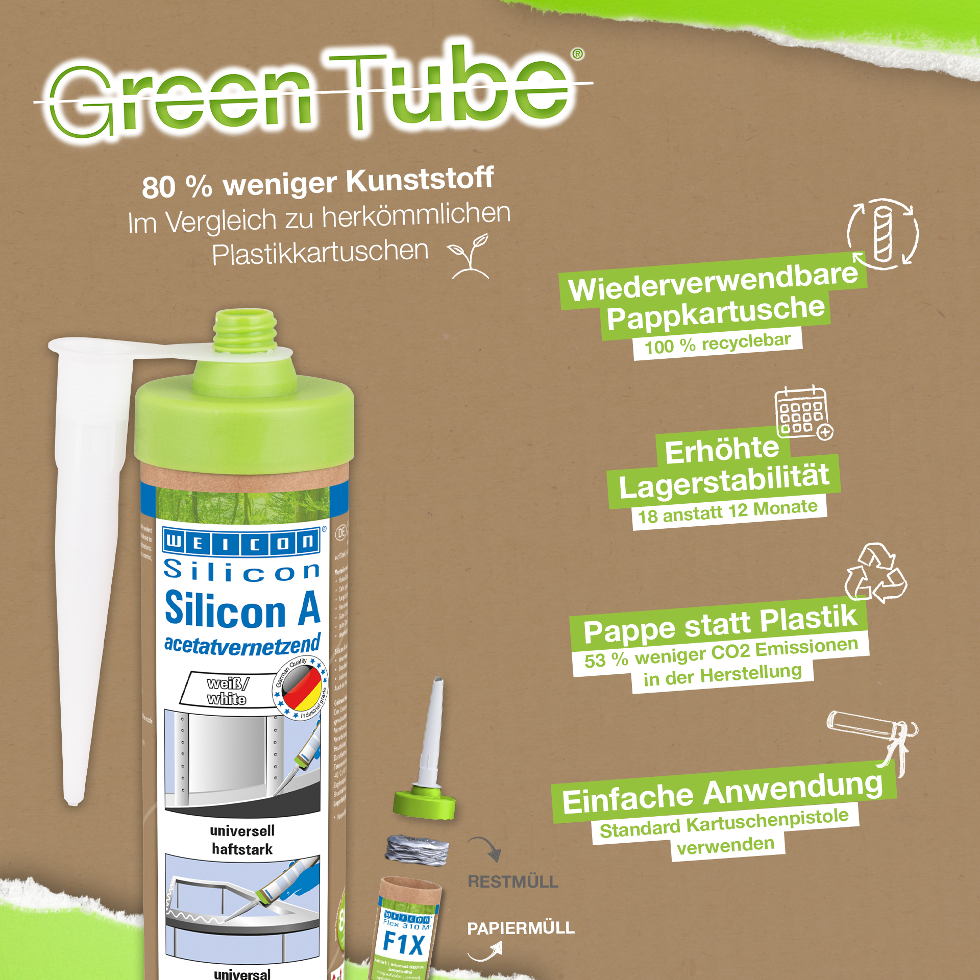 WEICON Silicone A is solvent-free, acetoxy-curing, strong, permanently elastic, resistant to ageing and chemicals, temperature-resistant up to +180 °C (+356 °F), extremely elastic (breaking elongation >700%) and can be used universally. Silicone A adheres very well to steel, aluminium, glass, ceramics, and many other materials. Silicone A can be used in machine and system construction, ventilation and air conditioning systems, in the energy and electrical industry, in exhibition construction and shopfitting and in many other industrial applications.