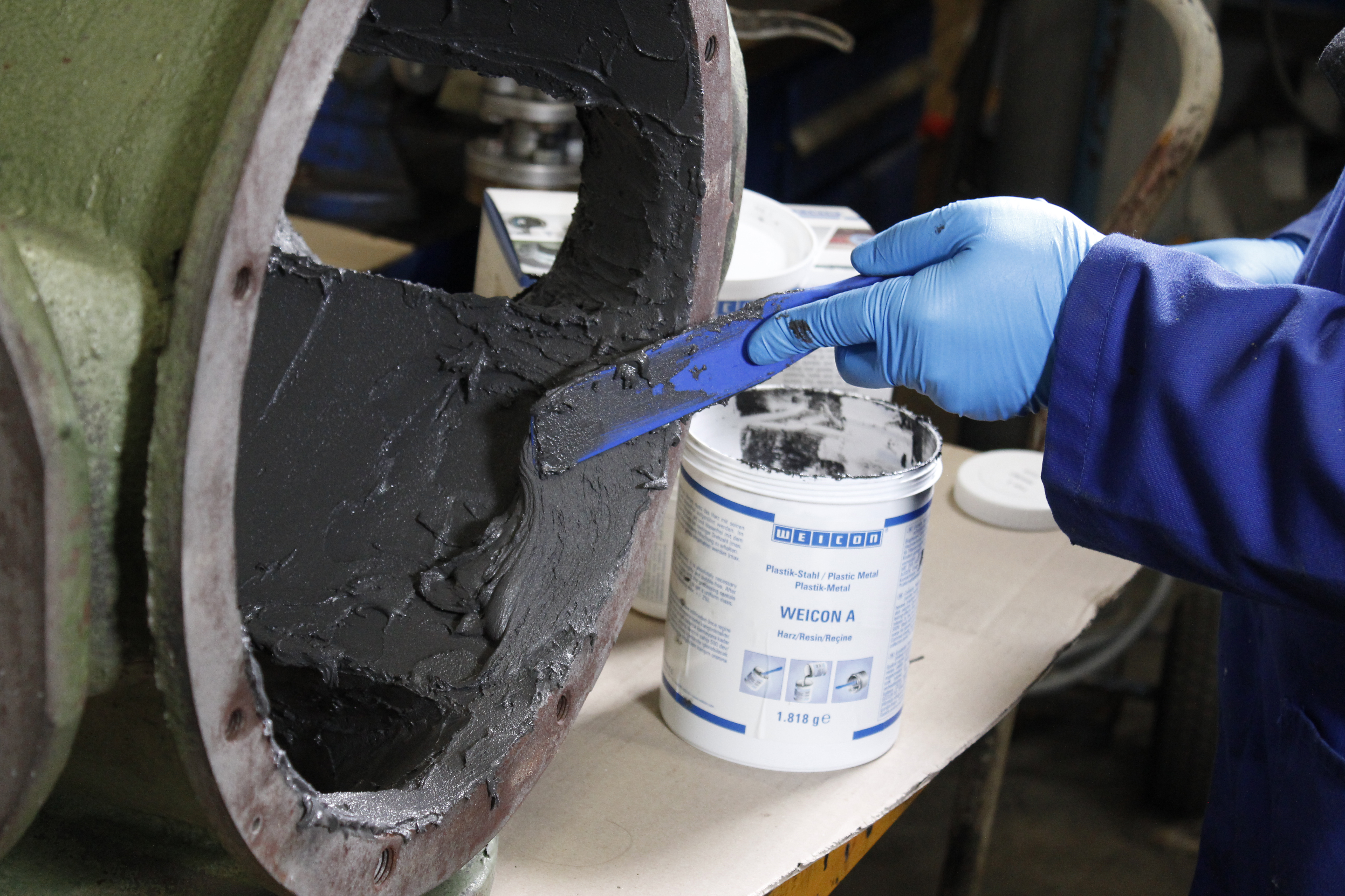 WEICON A has a DNV certificate and is particularly suitable for repair and maintenance work in the maritime industry. The epoxy resin system is highly filled with steel pigments, magnetic and its pasty texture allows application even on vertical surfaces. It can be used to remove corrosion damage and pitting or to repair holes and blowholes. For example, it can be used to reproduce heavy steel components showing severe damage by corrosion and pitting. In this case, WEICON A provides a real alternative to welding, as the application of the epoxy resin does not cause thermal distortion as in welding. The 2-component system can be used for repairs on tanks and pipes as well as for repairing cracks in engine or pump housings and machine parts. It is ideal for use in sewer systems where pipes and pipelines are exposed to strong media influences. Other applications include the manufacture of models, moulds, tools and clamping devices. WEICON A can be used in mechanical engineering, in toolmaking, in the cement industry, in power plants, in model and mould making, and in many other industrial sectors.