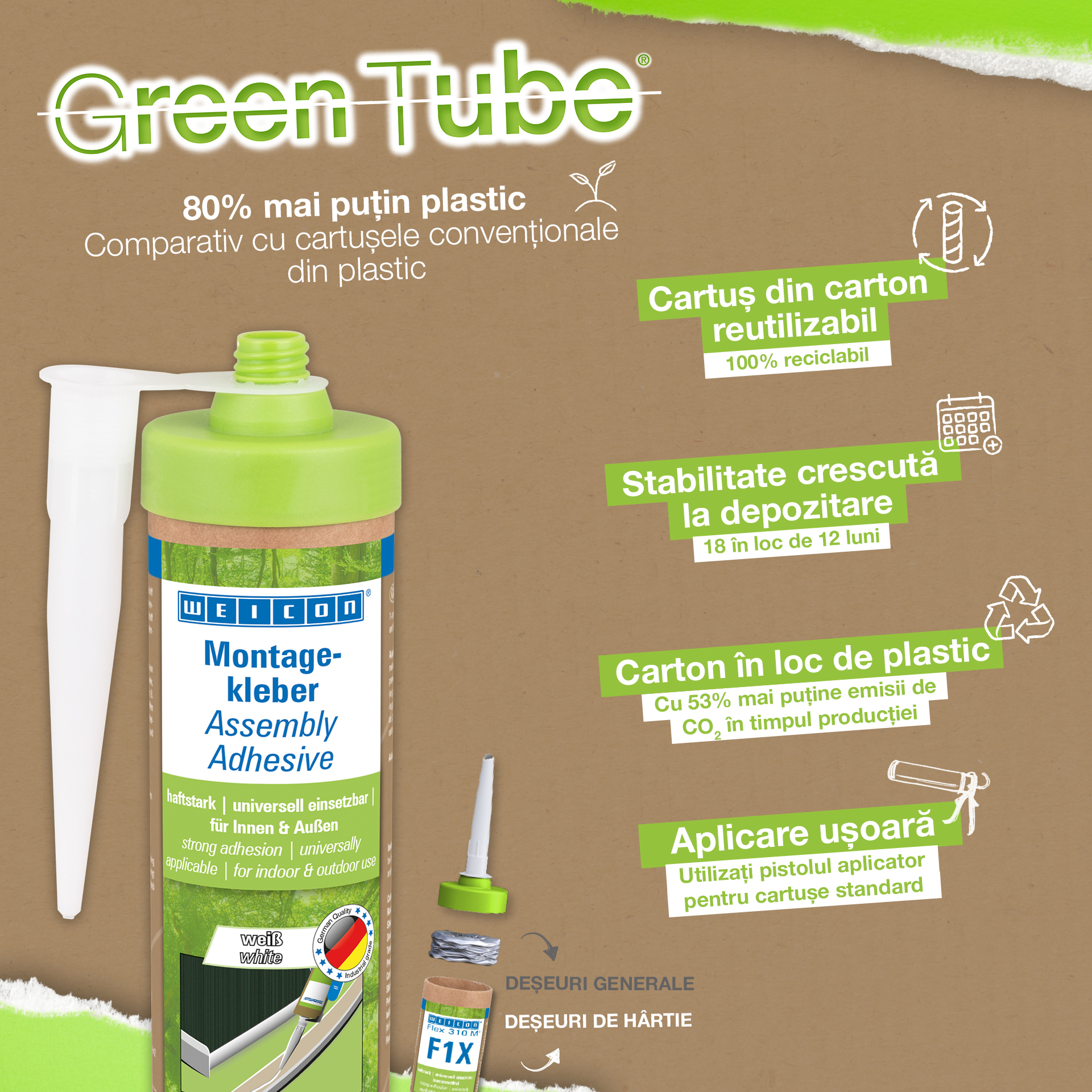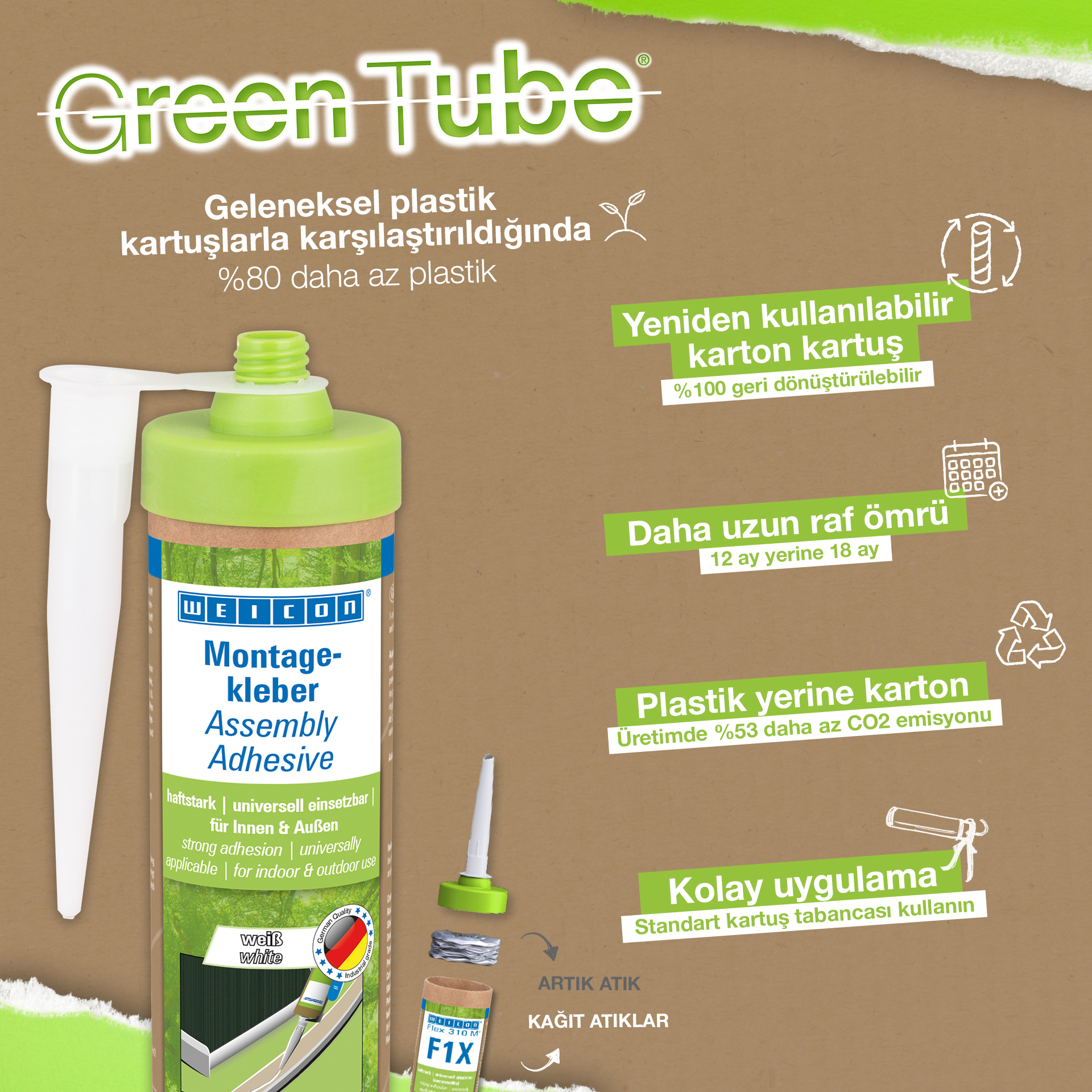 WEICON Assembly Adhesive is a strong dispersion acrylic adhesive for assembly, repair and touch-up work. The adhesive has a high initial adhesion and final strength and cures rapidly. After drying, the Assembly Adhesive can be sanded and plastered over and can be painted over with commercially available paints and varnishes. The adhesive is temperature-resistant in a range from -20°C to +80°C and is suitable for both indoor and outdoor applications. The white flexible adhesive is low-emission and free from solvents. The Assembly Adhesive is universally applicable and can be used for a wide variety of applications. It is ideal, for example, for surface bonding of wood-based materials (such as skirting boards, decorative mouldings, panels or chipboard), PVC, polystyrene, polystyrene foam boards, PU rigid foam (e.g. insulation boards and cable ducts), mineral materials (e.g. tiles) and metals on absorbent substrates such as plaster, concrete, fibre cement, plasterboard and untreated wood. Eco-friendly packaging – same strong performance! Green Tube, the sustainable packaging: the tip and lid are made from 100% recycled plastic, and the cartridge body is made entirely of cardboard. This means lower CO₂ emissions and reduced plastic use compared to conventional cartridges – all without compromising on performance!