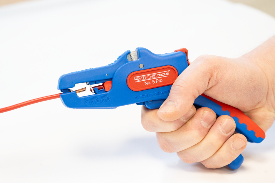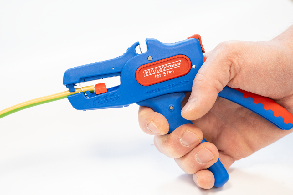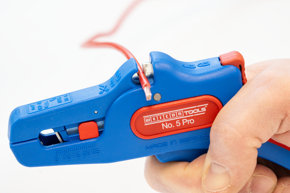 The automatic wire stripper can be used for stripping all common stranded and solid conductors from 0.2 to 16 mm². An adjustable length stop from 5 to 25 mm enables very precise and accurate working. The length stop can be removed, if required. The wire stripper automatically to adjusts to the required conductor cross-section – so no manual adjustment is necessary. The stripping tool features an integrated side cutter, which is suitable for conductors made of copper and aluminium up to a diameter of three millimetres. Thanks to slim design of the tool, the stripper can also be used in working areas that are difficult to access, such as in switch cabinets. The mechanics of the stripping tool are very smooth-running and have proven to be durable and reliable in numerous tests. The wire stripper has a non-slip multi-component handle in the blue-red "Ice Crack" design. The wire stripper has an eyelet to attach a strap for fall protection and is equipped with a labelling surface to be able to individualise the tool. In addition, the tool has a locking mechanism for space-saving storage.