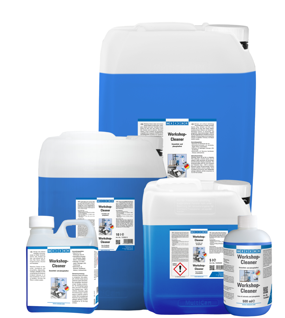 WEICON Workshop Cleaner cleans and degreases all metals, plastics, types of rubber, glass, ceramics and wood. Powerfully removes grease, oil, resin, soot, wax, nicotine, insect dirt, bitumen and tar splashes. Workshop Cleaner is free of solvent, emulsifier and phosphate compatible with oil separators (ÖNORM B 5105) and, in accordance with EC-guidelines, bio-degradable. It is highly concentrated and can be diluted with water on a ratio of 1:40 (max). It contains selected foamless tensides and, in addition to manual cleaning, can be used in high-pressure cleaners, part washing machines and spray apparatuses (e.g. Pump Dispenser WPS 1500).