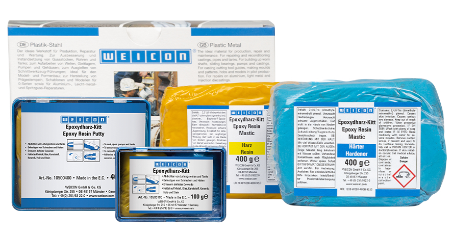 WEICON Epoxydharz-Kitt ist eine metallfreie, knetbare 2- komponentige Masse. Das Produkt ist vielseitig einsetzbar. Es eignet sich zur Ausbesserung und Instandsetzung von Gussstücken, zur Aufarbeitung von Wellen, Gleitlagern, Pumpen und Gehäusen, zur Erneuerung defekter Gewinde, zur Herstellung von Schablonen und Modellen und für Reparaturen an Aluminium, Leichtmetall und Spritzguss. Die Masse kann zum Abdichten von Leitungsrohren und Tanks und zur Befestigung von Schrauben und Haken genutzt werden. Sie kann zur Beseitigung von Korrosionsschäden und Lochfraß oder zur Ausbesserung von Löchern und Lunkern verwendet werden. Epoxydharz-Kitt haftet besonders gut auf allen Metallen und darüber hinaus auch auf Keramik, Glas, Stein, Beton, Holz, Gummi sowie vielen Kunststoffen. Im ausgehärteten Zustand ist WEICON Epoxydharz-Kitt mechanisch bearbeitbar, überlackierbar und gegenüber Benzin, Öl, Ester, Salzwasser und den meisten Säuren und Laugen beständig. Es verfügt über eine hohe Temperaturbeständigkeit bis +200 °C (+392 °F), ist nicht magnetisch und nicht korrosiv. Durch das einfache Mischungsverhältnis von 1:1 nach Gewicht und Volumen, lassen sich Harz und Härter sehr unkompliziert in der gewünschten Menge portionieren. WEICON Epoxydharz-Kitt kann im Maschinenbau, im Werkzeugbau, im Modell- und Formenbau sowie in vielen weiteren Bereichen der Industrie zum Einsatz kommen.
