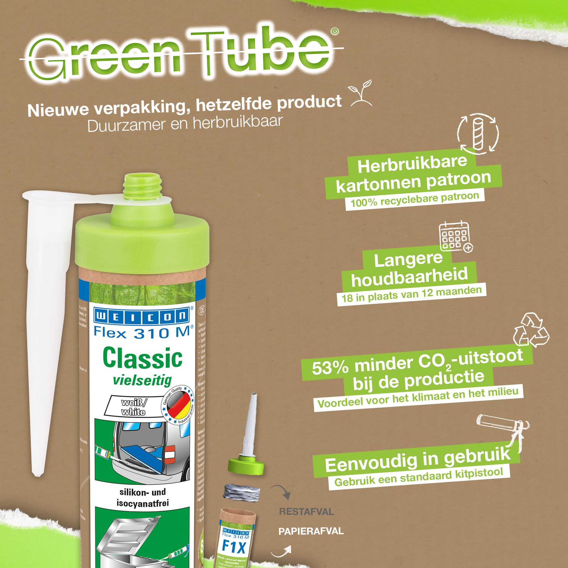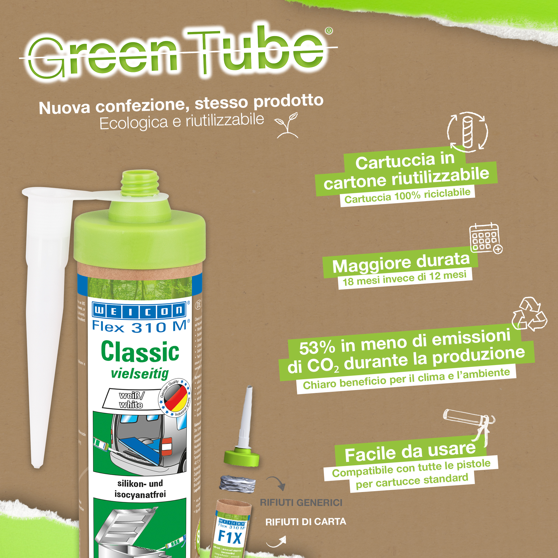 WEICON Flex 310 M Classic ist haftstark, „nass in nass“ überlackierbar, schleiffähig, hat eine hervorragende Alterungsbeständigkeit und eine gute UV-Stabilität. Es ist beständig gegenüber Süß- und Salzwasser und ist silikon-, isocyanat-, halogen- und lösemittelfrei. Das Produkt ist ISEGA zertifiziert und kann als Klebstoff in der Lebensmitteltechnologie verwendet werden. Flex 310 M Classic ist ein elastischer Klebstoff auf MS-Polymer-Basis und eignet sich für Verklebungen von Metallen, vielen Kunststoffen, Keramik, Holz, Glas und Stein. Der Kleb- und Dichtstoff kann im Metallbau, im Behälter- und Apparatebau, im Karosserie-, Fahrzeug- und Containerbau, in der Lüftungs- und Klimatechnik, in der Elektroindustrie, im Yacht- und Bootsbau und überall dort, wo Silikone bzw. silikonhaltige Produkte nicht geeignet sind, zum Einsatz kommen.