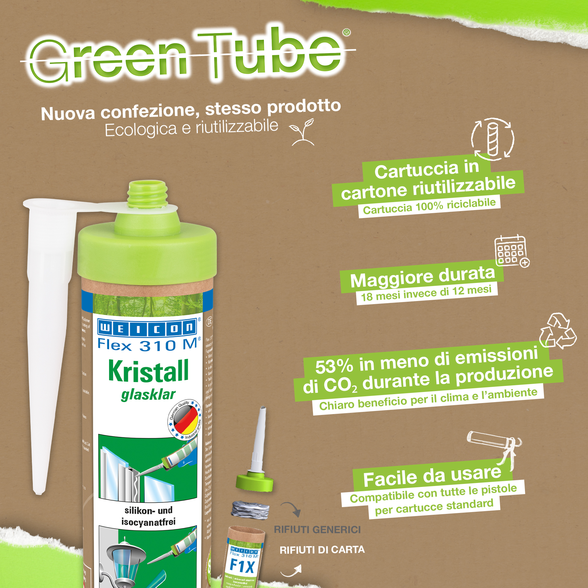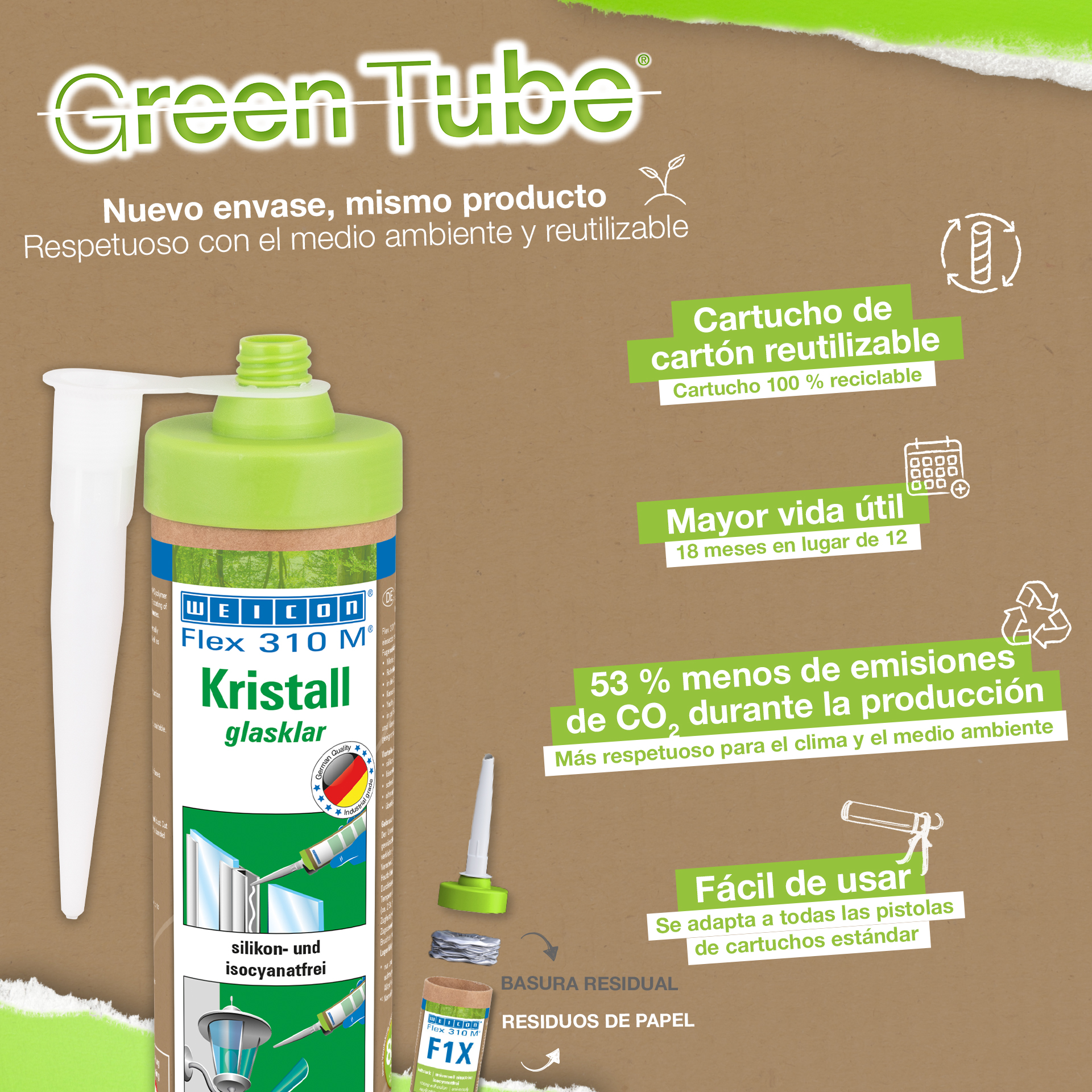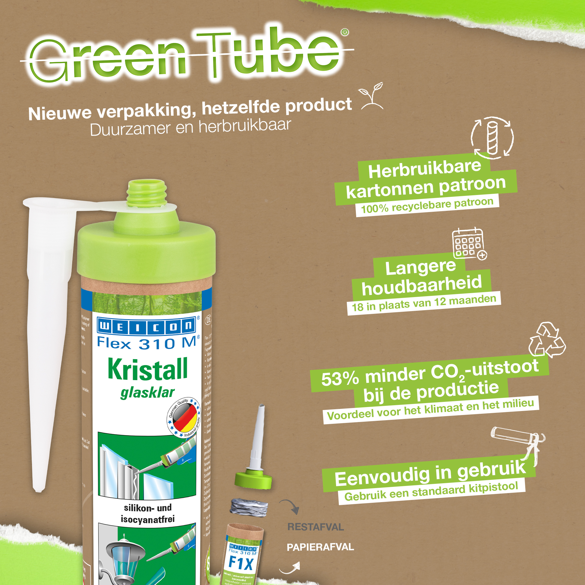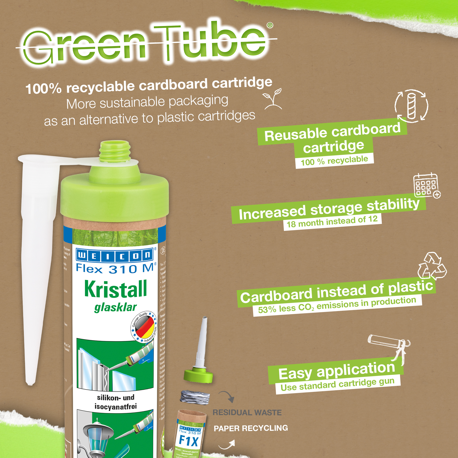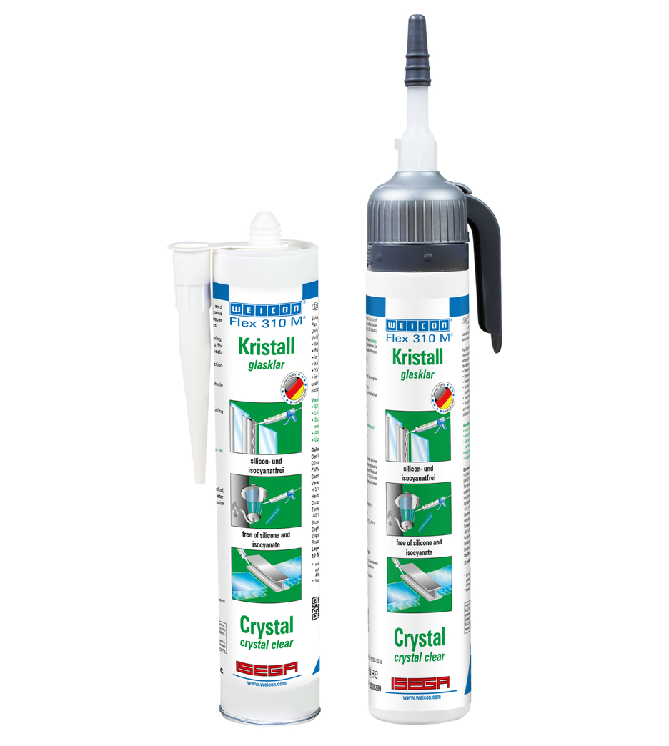 WEICON Flex 310 M Kristall ist transparent, haftstark, „nass in nass“ überlackierbar, hat eine hervorragende Alterungsbeständigkeit, eine gute UV-Stabilität, ist silikon-, isocyanat-, halogen- und lösemittelfrei. Es ist ISEGA zertifiziert und kann als Klebstoff in der Lebensmitteltechnologie verwendet werden. Flex 310 M Kristall ist ein elastischer Klebstoff auf MS-Polymer-Basis und eignet sich für Verklebungen von Glas, PC* und Acrylglas*, Metallen, vielen Kunststoffen, Keramik, Holz und Stein. Das Produkt ist nach der Aushärtung glasklar und besonders geeignet für elastische Verbindungen, bei denen der Klebstoff nicht sichtbar sein soll bzw. darf. Es kann in der Kunststoffverarbeitung, im Metallbau, im Behälter- und Apparatebau, in der Lüftungs- und Klimatechnik, in der Elektro- und Leuchtenindustrie, im Messe- und Ladenbau und überall dort, wo Silikone bzw. silikonhaltige Produkte nicht geeignet sind, zum Einsatz kommen. (* = Nur spannungsfrei verkleben)