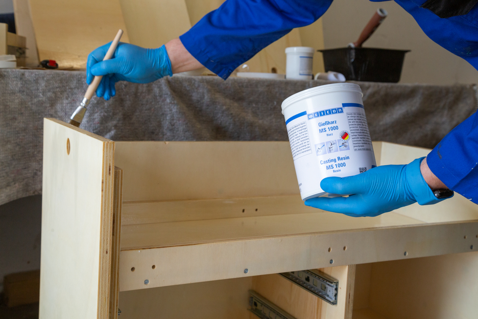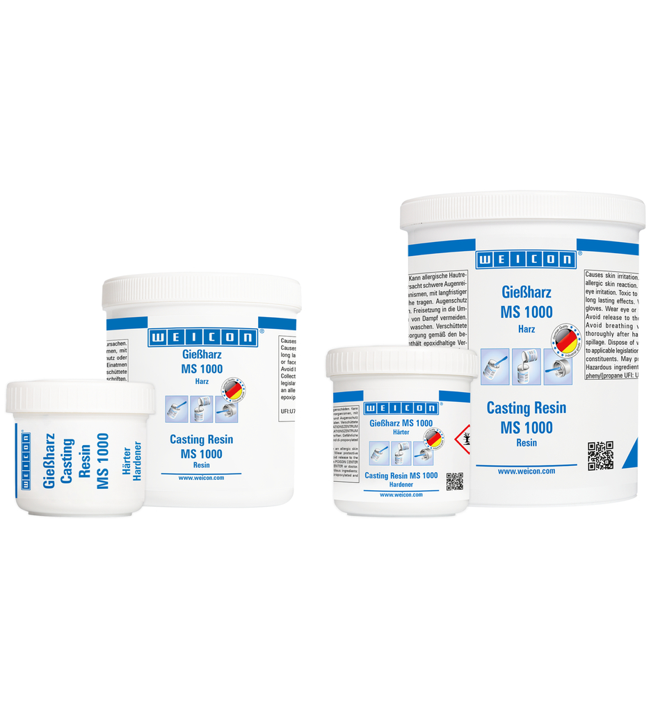 WEICON Gießharz MS 1000 ist ein transparentes und sehr fließfähiges Epoxidharz-System mit hoher mechanischer Festigkeit. Es eignet sich für ein breites Anwendungsspektrum. MS 1000 haftet gut auf Metall, Holz, Hartschäumen sowie vielen Kunststoffen. Es kann für großflächige Verklebungen oder zum Laminieren von Composite Gewindebuchsen und Schrauben verwendet werden. Durch die sehr niedrige Viskosität eignet sich das Epoxidharz-System auch sehr gut zum Vergießen von elektrischen Bauteilen. Es kann bei der Herstellung von Faserverbundwerkstoffen, im Werkzeug- und Formenbau, in der Elektroindustrie, im Maschinenbau und in vielen weiteren industriellen Bereichen eingesetzt werden. MS 1000 weist eine gute Benetzung und Durchdringung von Glasgewebe auf und eignet sich daher gut zum Laminieren von Glas-, Aramid- und Kohlefasern zur Herstellung faserverstärkter Teile. Es lässt sich ebenfalls problemlos mit verschiedenen Füllstoffen (pulverförmig, faser- und gewebeartig) versetzen.