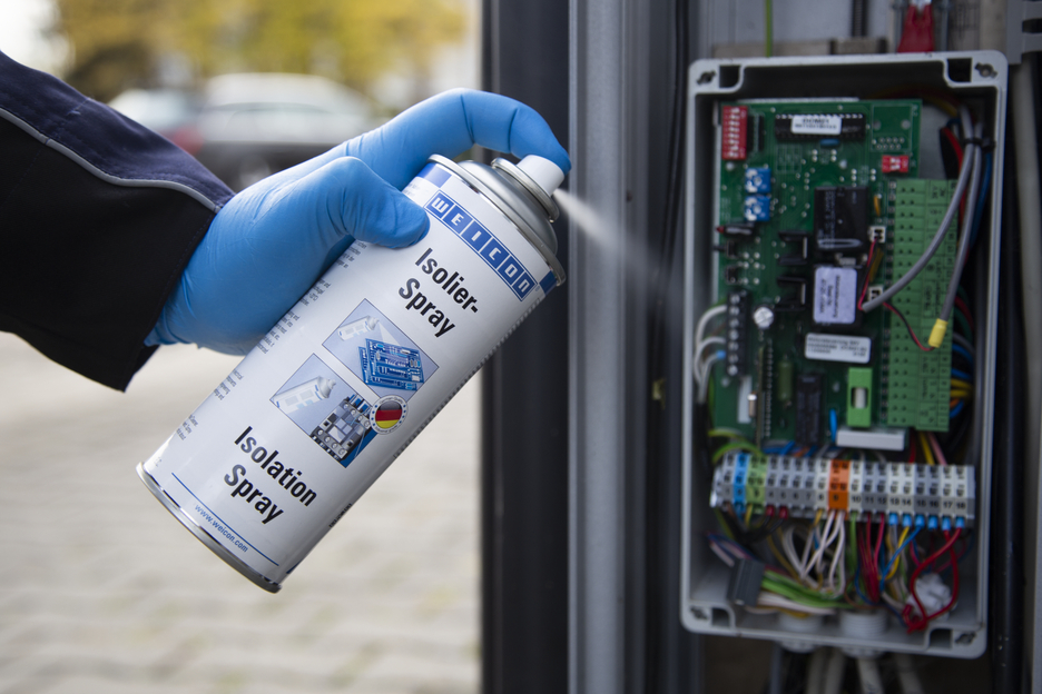 WEICON Isolier-Spray ist ein transparenter Isolier- und Überzugslack auf Acrylharzbasis. Es bildet einen flexiblen und widerstandsfähigen Film, welcher hervorragend auf fast allen Werkstoffen wie Metall, Glas, Kunststoff oder Holz haftet. Isolier-Spray ist beständig gegen UV-Strahlen, Säuren, Öle und Laugen. Es ist feuchtigkeits- und witterungsbeständig und zeichnet sich besonders durch seine hohe Durchschlagsfestigkeit aus. Das Spray schützt vor Feuchtigkeit sowie vor verschiedenen Dämpfen. Es dient als Schutzüberzug für Leiterplatten, an elektrischen Verbindungen, Schaltern, Schaltanlagen, elektronischen Bauteilen und Spulen, als Universalversiegelung in der Elektrotechnik oder zum Ausbessern von Isolierungen an Elektromotoren, Wicklungen und Rahmen.