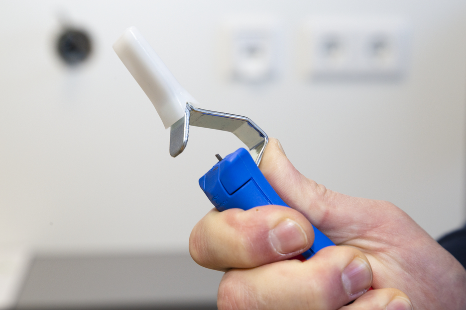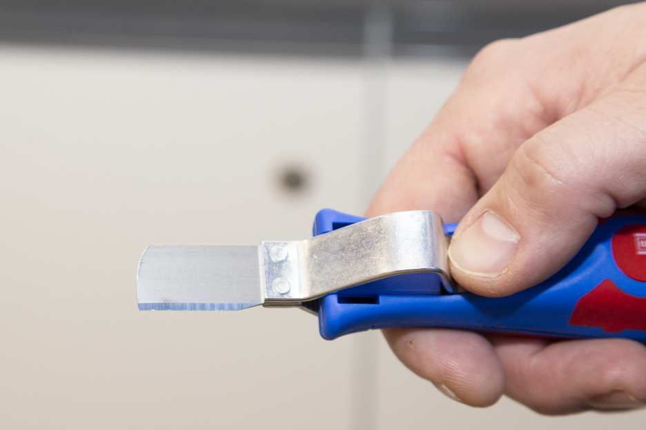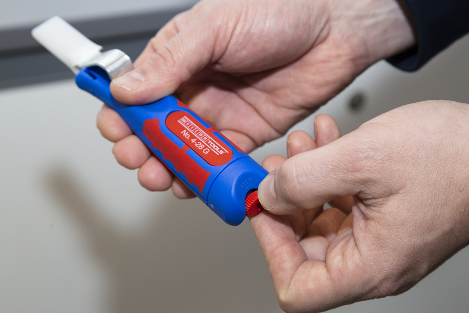 Das Kabelmesser 4-28 G ermöglicht ein präzises, schnelles und sicheres Abmanteln aller gängigen Rundkabel mit einem Durchmesser zwischen 4 und 28 Millimeter. Das Kabelmesser verfügt über einen ergonomisch geformten, rutschfesten Mehrkomponenten-Griff. Mit Hilfe einer Stellschraube am Griffende kann die Schnitttiefe des Schneidmessers stufenlos reguliert werden. Dies verhindert eine Beschädigung der inneren Leiter. Das Schneidmesser ist selbstdrehend im Gehäuse integriert und ermöglicht so die automatische Umstellung von Rund- auf Längsschnitt. Zusätzlich verfügt das 4-28 G über eine gerade Klinge, die mit einer Schutzkappe versehen werden kann.