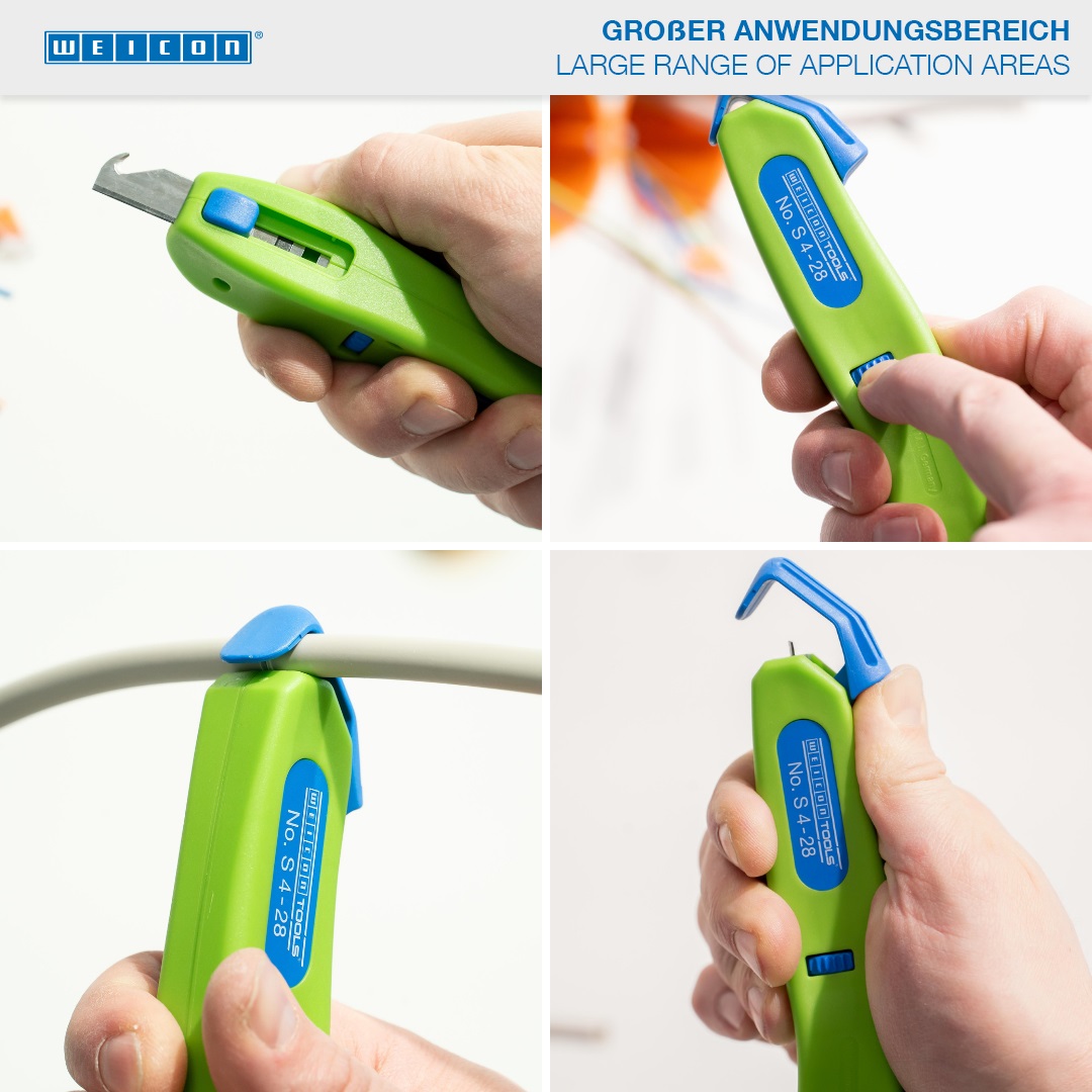 Die WEICON TOOLS Green Line ist eine ganz besondere Produktlinie, die speziell auf Nachhaltigkeit und Schonung der Ressourcen ausgerichtet ist. Die Green Line umfasst Abisolierwerkzeuge, die aus bis zu 97 % nachwachsenden und natürlichen Rohstoffen bestehen. Das Kabelmesser S 4-28 ermöglicht ein präzises, schnelles und sicheres Abmanteln aller gängigen Rundkabel mit einem Durchmesser zwischen 4 und 28 Millimeter. Mit Hilfe eines Stellrades im Gehäuse kann die Schnitttiefe des Schneidmessers stufenlos reguliert werden. Dies verhindert eine Beschädigung der inneren Leiter. Das Schneidmesser ist selbstdrehend im Gehäuse integriert und ermöglicht so die automatische Umstellung von Rund- auf Längsschnitt. Zusätzlich wurde eine Hakenklinge in das S 4-28 integriert, die im Gehäuse versenkt werden kann. In beiden Positionen ist die Klinge arretierbar. Das führt zu einer deutlichen Reduktion des Verletzungsrisikos, das feststehende Klingen mit sich bringen.