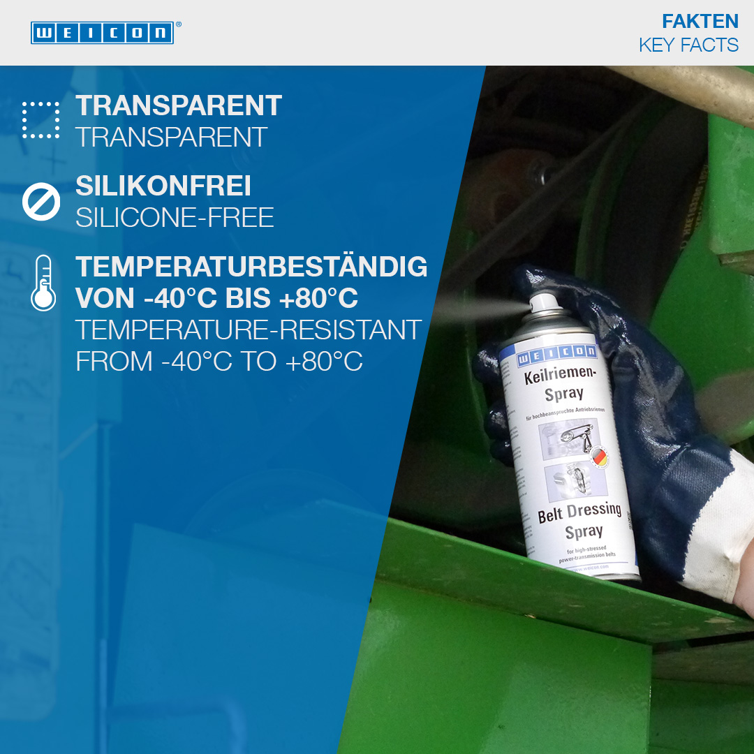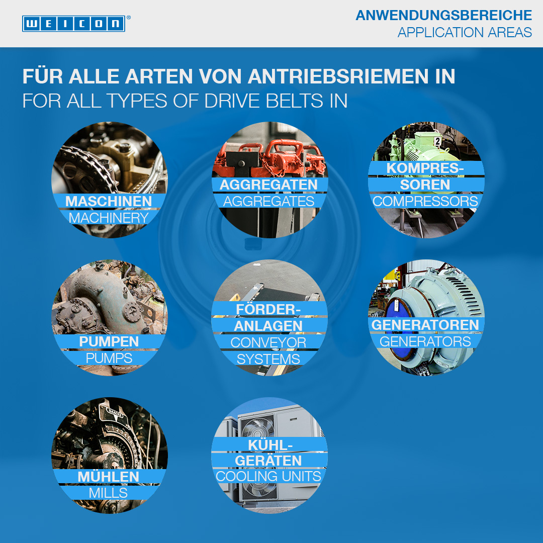 WEICON Keilriemen-Spray ist eine transparente Riemenbeschichtung auf Basis von synthetischen Elastomeren für stark beanspruchte Antriebsriemen unterschiedlichster Art. Es erhöht die Standzeit, verlängert die Lebensdauer von Maschinen und Anlagen, verhindert Riemenschlupf, überträgt die volle Antriebsleistung, beseitigt und verhindert Quietschen, dringt porentief ein, erhöht den Wirkungsgrad der Zugkraft, wirkt reibungserhöhend und haftvermittelnd, verhindert statische Aufladung, sichert die Geschmeidigkeit und schützt vor Alterung. Keilriemen-Spray für alle Arten von Riemen und Bändern aus gängigen Materialien, wie zum Beispiel Gewebe, Leder, Gummi oder PVC. Es kann bei Keilriemen, Gliederkeilriemen, Treibriemen, Flachriemen, Rundriemen, Zahnriemen, Transmissionsriemen, Rippenbändern oder Förderbändern eingesetzt werden. WEICON Keilriemen-Spray eignet sich besonders für alle Arten von Antriebsriemen in Maschinen, Aggregaten, Kompressoren, Pumpen, Generatoren, Förderanlagen, Mühlen, Säulenbohrmaschinen und Kühlgeräten. Kann auch bei laufendem Betrieb unter Einhaltung der jeweiligen Sicherheitsbestimmungen eingesetzt werden.