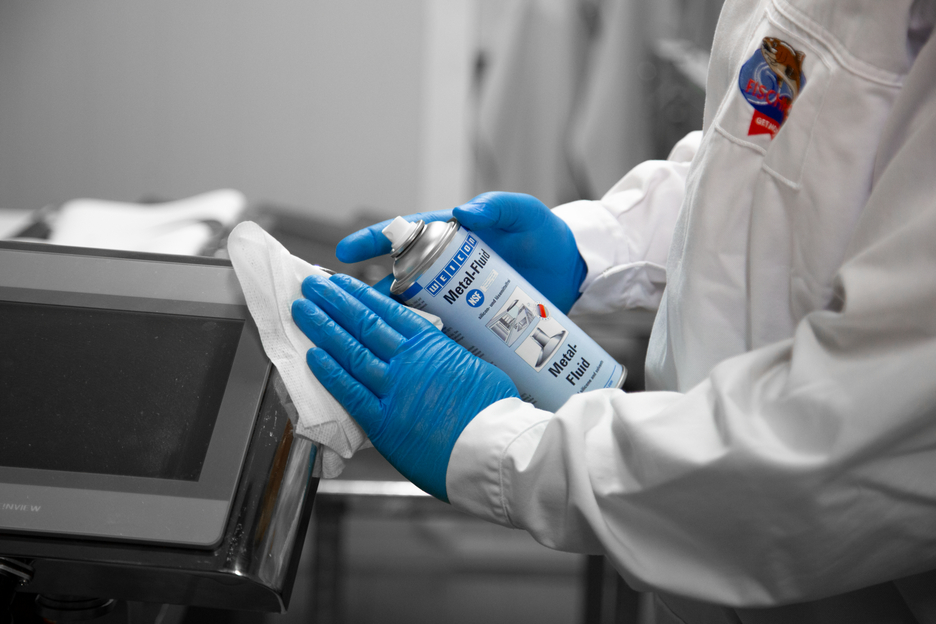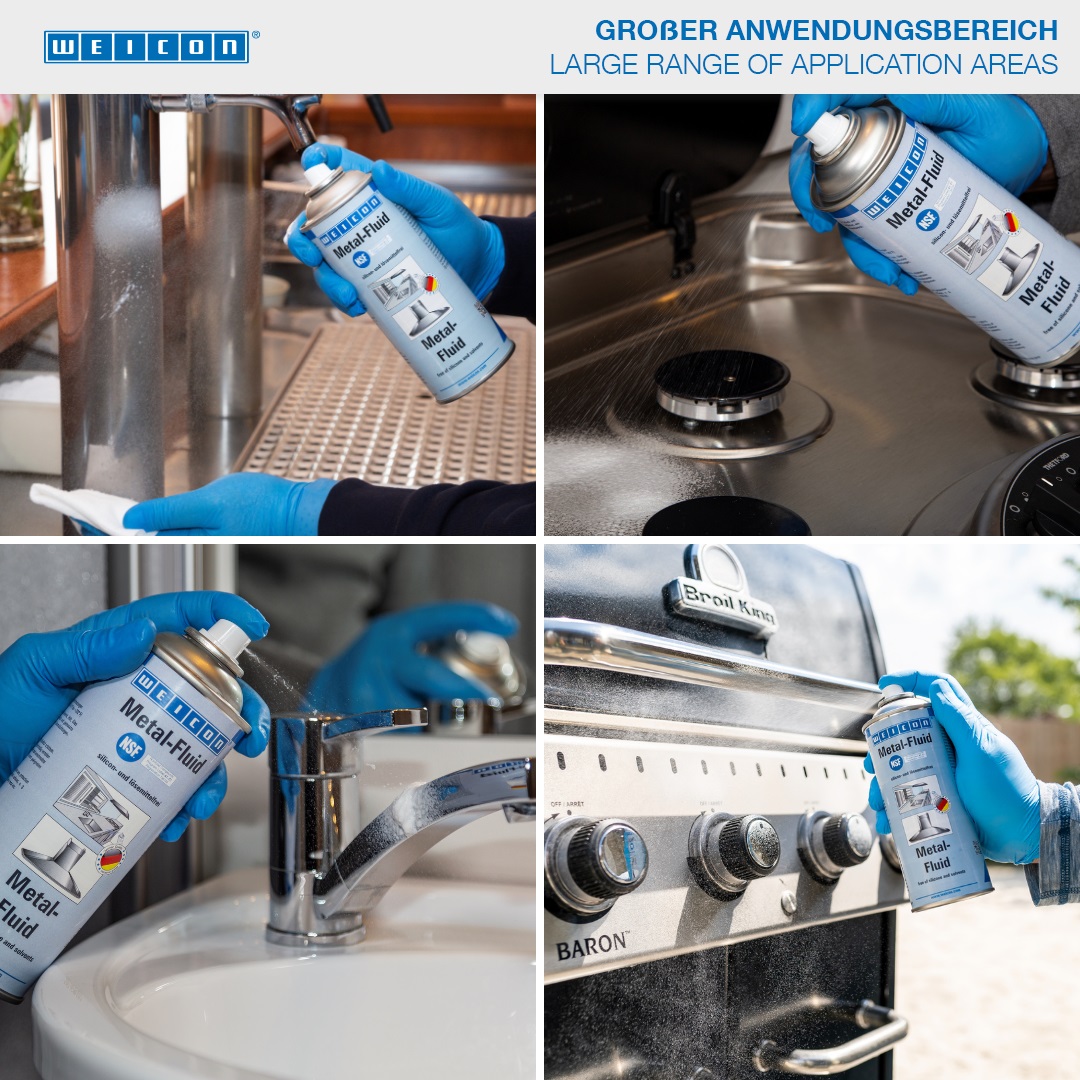 WEICON Metal-Fluid ist ein Pflege- und Reinigungsmittel für matte und polierte Oberflächen im Innenbereich und hat eine NSF-Zulassung. Metal-Fluid pflegt, schützt und reinigt sowohl Metalloberflächen als auch Keramik, Holz, Glas und Kunststoffe. Geätzte und gedruckte Beschriftungen sowie Kunststoffoberflächen und Gummidichtungen werden nicht angelöst.