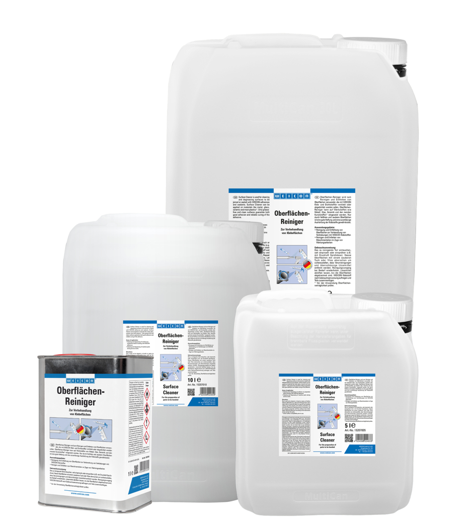 WEICON Oberflächenreiniger wird zum Reinigen und Entfetten von Oberflächen verwendet, die mit WEICON Kleb- und Dichtstoffen verklebt oder abgedichtet werden sollen. Oberflächenreiniger kann auf Werkstoffen wie Metall, Glas, Keramik und den meisten Kunststoffen eingesetzt werden. Er kann zum Beispiel zum Reinigen und Entfetten von Maschinenteilen im Zuge von Wartungsarbeiten genutzt werden.