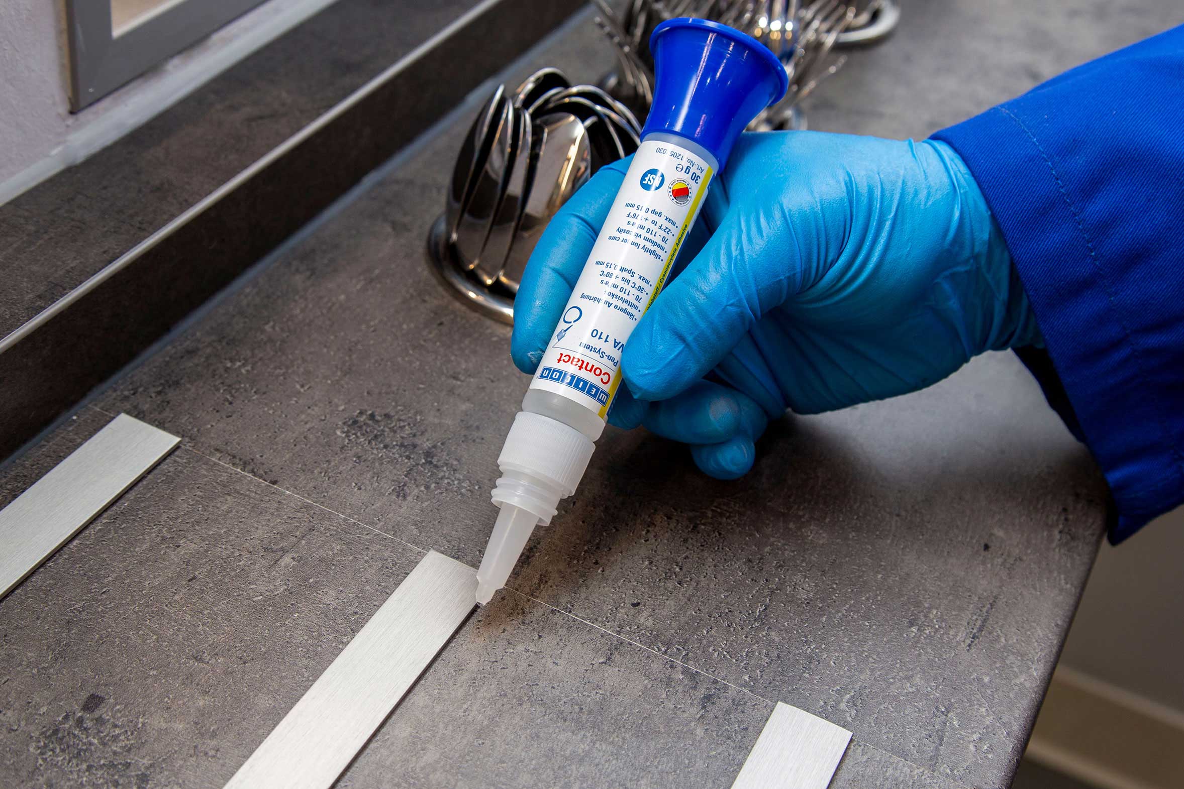 Mit dem NSF-geprüften Cyanacrylatklebstoff WEICON VA 110 lassen sich kleine Reparaturen an Bauteilen im Lebensmittel- oder Trinkwasserbereich oder in der Pharmaindustrie zeitsparend durchführen. In Sekunden bis wenigen Minuten können Gummi, Kunststoff oder Metall geklebt werden, so auch diese Gleitschiene an einer Essensausgabe.