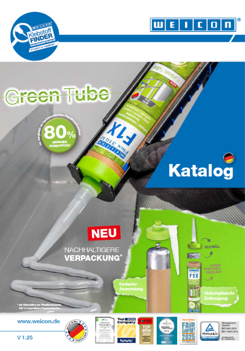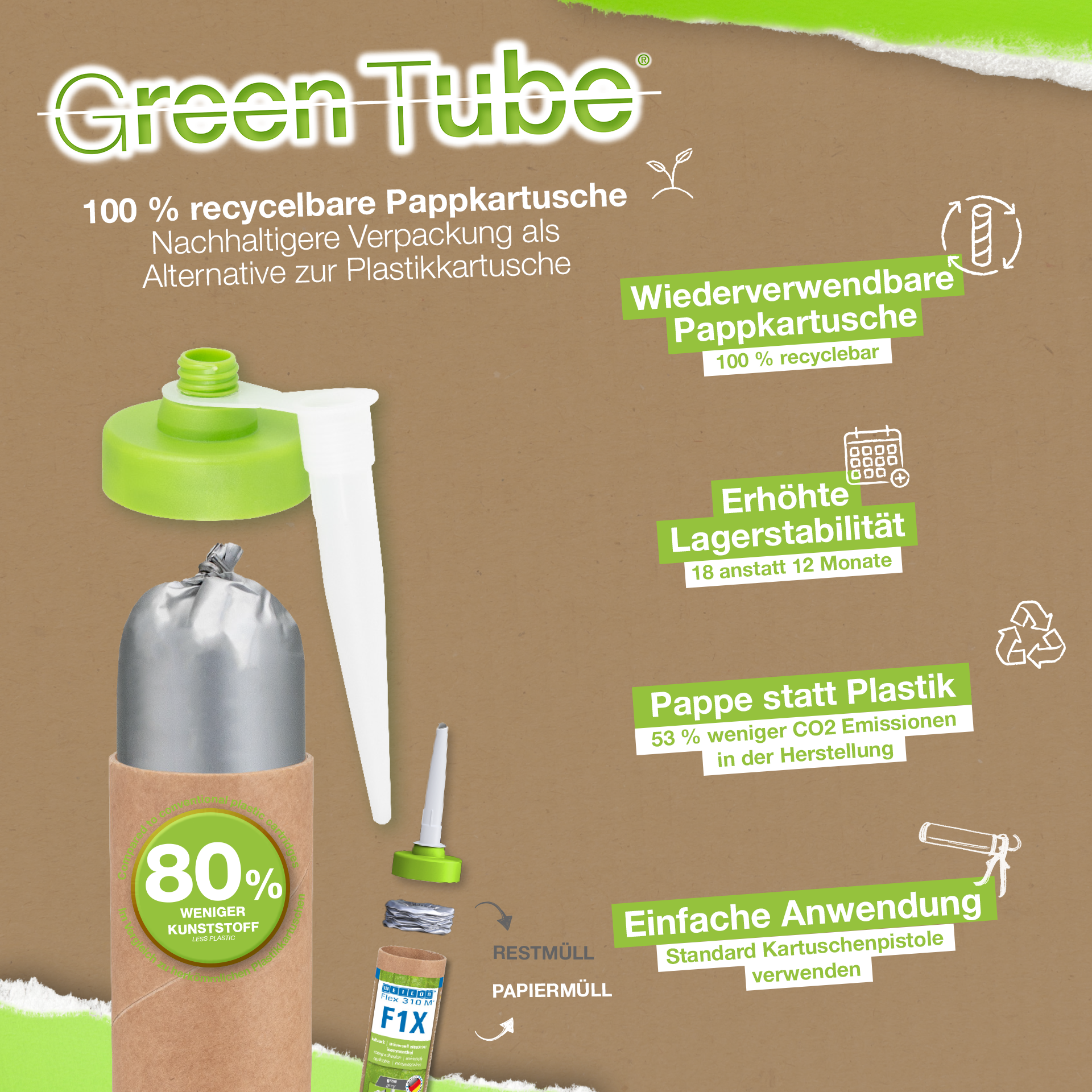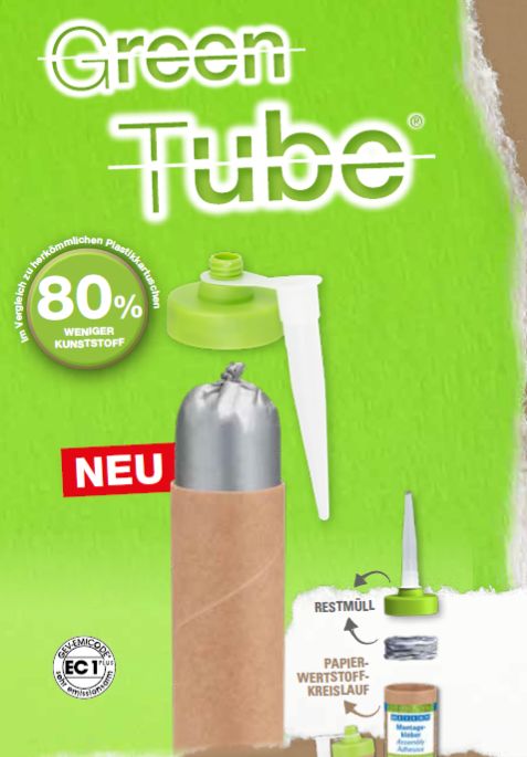 In der Herstellung der Green Tube Kartusche wird 80 % weniger Kunststoff verarbeitet als für herkömmliche Kartuschen. Der Kartuschenkörper besteht zu 100 % aus gehärteter Pappe. Die Produktion verursacht 53 % weniger CO2-Emissionen als die Herstellung einer PE-Kartusche – ein klarer Vorteil für Klima und Umwelt.