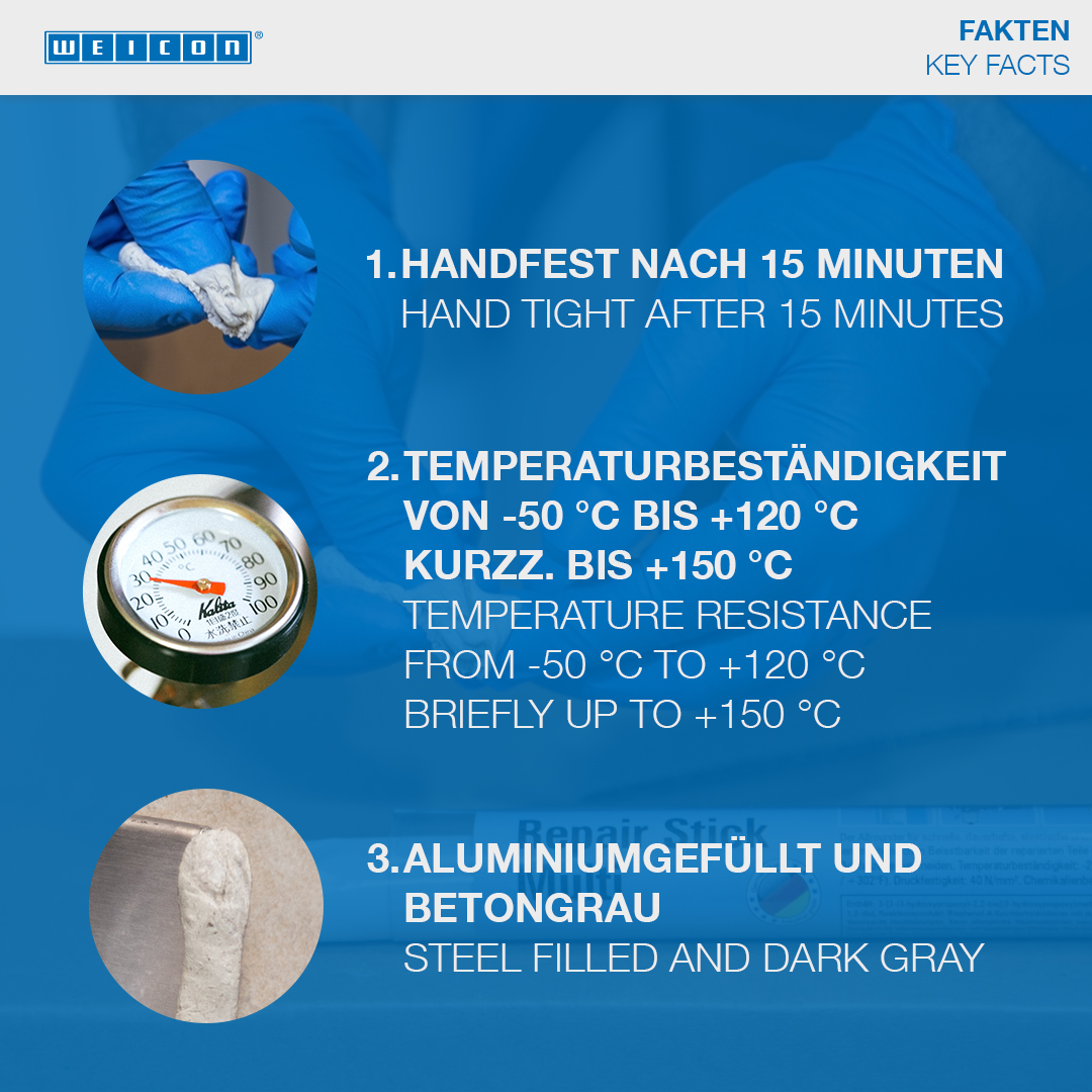 Für schnelle und nicht rostende Reparaturen und Verklebungen von Metallteilen. Zum Ausbessern von Rissen, Löchern, Leckagen und Undichtigkeiten an Karosserien, Getriebegehäusen und Behältern, Fensterrahmen und Profilen, Booten und Modellen. WEICON Repair Stick Aluminium kann im Maschinen- und Anlagenbau, in der Automobilindustrie, im Getriebebau, im Modellbau und in vielen weiteren Bereichen eingesetzt werden.