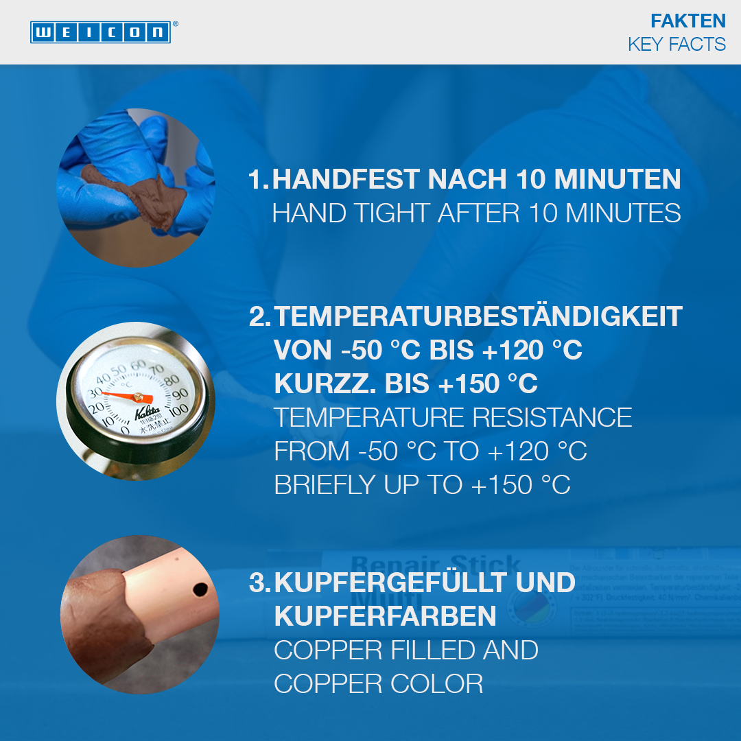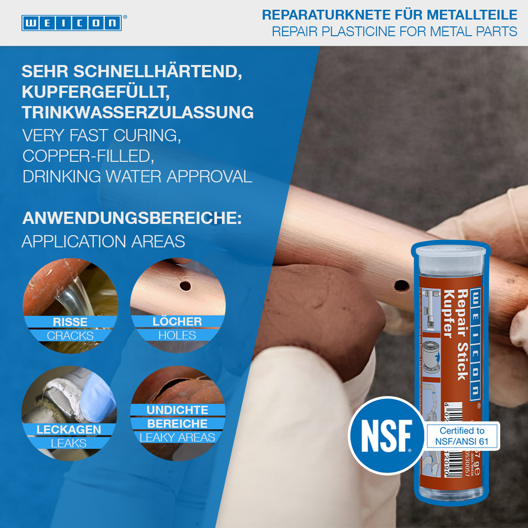 WEICON Repair Stick Kupfer eignet sich für sehr schnelle Reparaturen und Ausbesserungen von Rissen, Leckagen und Undichtigkeiten. Das Epoxidharz-System hat eine sehr schnelle Verarbeitungszeit von nur drei Minuten und kann auch auf feuchten und nassen Flächen eingesetzt werden. Mit dem Stick lassen sich Rohre und Rohrbögen, Fittings und Flansche, Kupferrinnen und -bleche, Wassererhitzer, Wassertanks, Warm- und Kaltwasserleitungen und Gefrier- und Klimaanlagen schnell und unkompliziert reparieren und ausbessern. WEICON Repair Stick Kupfer kann im Behälter- und Apparatebau, in der Lebensmittel-, Kosmetik- und Pharmaindustrie und in vielen anderen Bereichen zum Einsatz kommen.