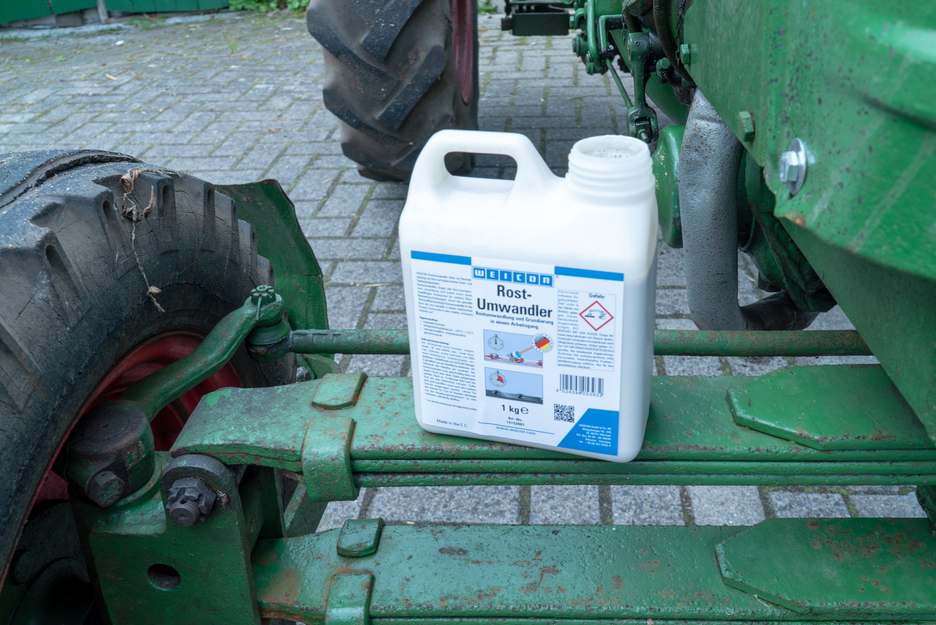 WEICON Rostumwandler dient zur Neutralisierung von Rost auf angerosteten Eisen- und Stahluntergründen und stoppt zuverlässig den Korrosionsprozess. Durch die spezielle Wirkstoffformel aus Säure und Tannin dringt der Rostumwandler in den Rost ein. Er wandelt in einem chemischen Prozess Eisenoxide in eine stabile Schicht um und hinterlässt zusätzlich durch Zinkphosphat einen temporären Korrosionsschutz. Je nach Kohlenstoffgehalt des Metalls verfärbt sich die behandelte Fläche bläulich-, bräunlich bis schwarz. Die Schicht bildet die ideale Basis für darauffolgende Schutzbeschichtungen, wie z. B. WEICON Zink-Spray. Mit WEICON Rostumwandler werden optimale Ergebnisse bei leicht verrosteten Oberflächen mit einem Rostgrad A und B erreicht. Loser Rost und lose Teile sollten vorher mechanisch entfernt werden. Der Umwandler wird erst aktiv, wenn er auf Rost oder Metall aufgetragen wird und kann großflächig an allen rostigen Stellen, beispielsweise an Maschinen und Anlagen, an landwirtschaftlichen Geräten sowie an Kraftfahrzeugen verwendet werden. Im Gegensatz zu anderen Umwandlern wird WEICON Rostumwandler nach Ablauf der Reaktionszeit mit klarem Wasser und einem Schwamm oder einer weichen Bürste von der behandelten Oberfläche entfernt. Dies dient der Beseitigung von Reststoffen, die sich durch den Umwandlungsprozess gebildet haben.