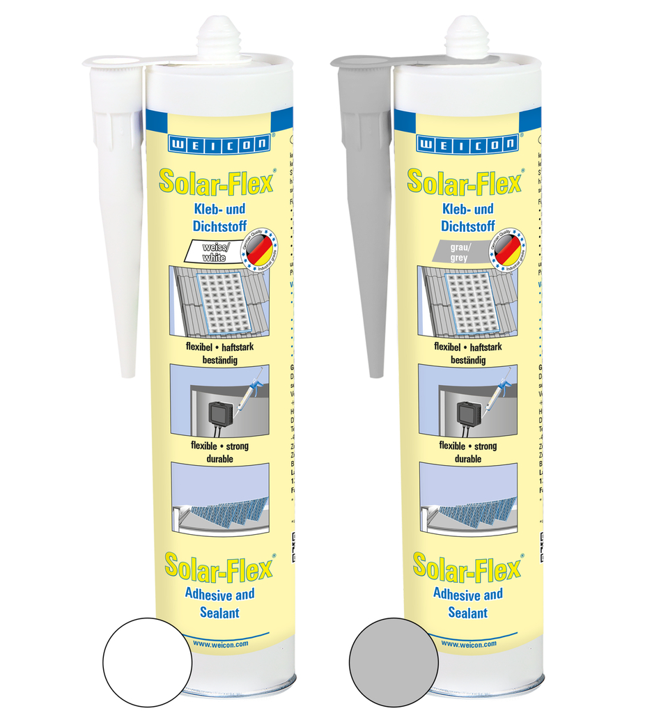 WEICON Solar-Flex ist haftstark, nicht korrosiv, „nass in nass“ überlackierbar, witterungsbeständig, UV-beständig und silikon-, isocyanat-, halogen- und lösemittelfrei. Solar-Flex ist ein elastischer Klebstoff auf MS-Polymer-Basis speziell für die Solarindustrie. Die sehr hohe Anfangshaftung und der schnelle Klebkraftaufbau ermöglichen Verklebungen auch an senkrechten Flächen. Ersetzt herkömmliche Befestigungsmethoden bei der Montage von Solar- und Photovoltaikanlagen.