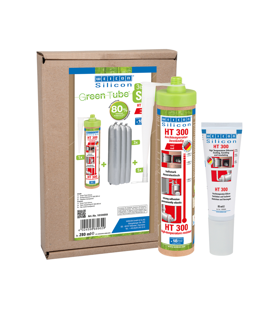 WEICON HT 300 ist rot, hochtemperaturbeständig (+300 °C/+572 °F), lösemittelfrei, haftstark, acetatvernetzend, witterungs-, alterungs- und chemikalienbeständig und extrem elastisch (Bruchdehnung von ca. 300%). Das Produkt ist besonders geeignet für hitzebelastete Verklebungen und Abdichtungen und haftet sehr gut auf Stahl, Aluminium, Glas, Keramik und vielen weiteren Werkstoffen. Der Kleb- und Dichtstoff kann in Industrieöfen, Rauchgasanlagen, Heizungsanlagen, Abgasführungen, Wärmeschränken und in vielen weiteren Bereichen eingesetzt werden.